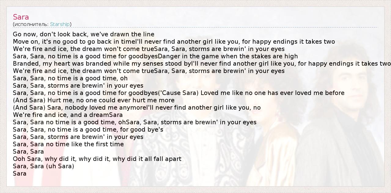 (And Sara) Sara, nobody loved me anymoreI'll never find another girl like you, no