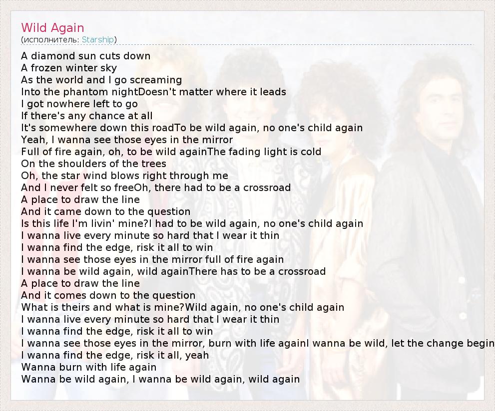 A diamond sun cuts down A frozen winter sky As the world and I go screaming Into the phantom nightDoesn't matter where it leads I got nowhere left to go If there's any chance at all It's somewhere down this roadTo be wild again, no one's child again Yeah, I wanna see those eyes in the mirror Full of fire again, oh, to be wild againThe fading light is cold On the shoulders of the trees Oh, the star wind blows right through me And I never felt so freeOh, there had to be a crossroad A place to draw the line And it came down to the question Is this life I'm livin' mine?I had to be wild again, no one's child again I wanna live every minute so hard that I wear it thin I wanna find the edge, risk it all to win I wanna see those eyes in the mirror full of fire again I wanna be wild again, wild againThere has to be a crossroad A place to draw the line And it comes down to the question What is theirs and what is mine?Wild again, no one's child again I wanna live every minute so hard that I wear it thin I wanna find the edge, risk it all to win I wanna see those eyes in the mirror, burn with life againI wanna be wild, let the change begin I wanna find the edge, risk it all, yeah Wanna burn with life again Wanna be wild again, I wanna be wild again, wild again