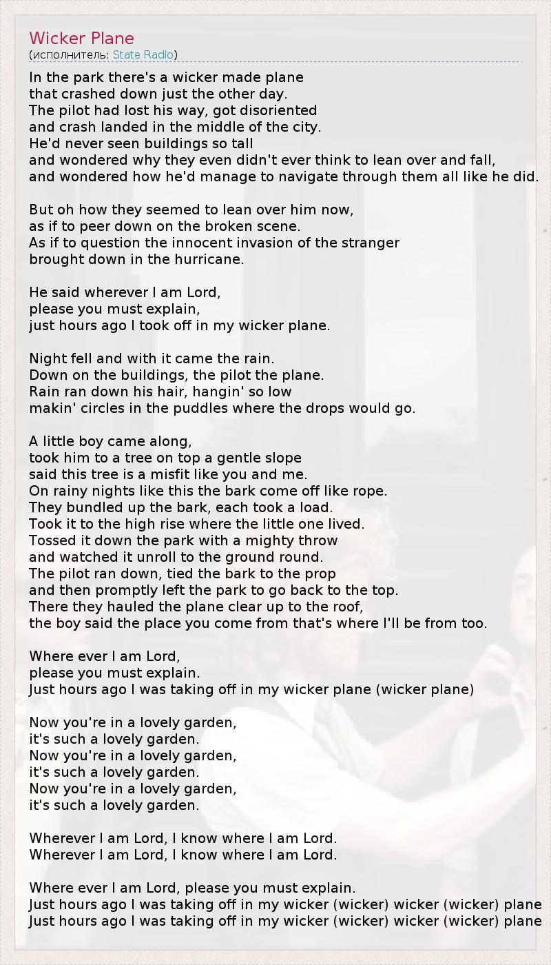 In the park there's a wicker made plane that crashed down just the other day. The pilot had lost his way, got disoriented and crash landed in the middle of the city. He'd never seen buildings so tall and wondered why they even didn't ever think to lean over and fall, and wondered how he'd manage to navigate through them all like he did. But oh how they seemed to lean over him now, as if to peer down on the broken scene. As if to question the innocent invasion of the stranger brought down in the hurricane. He said wherever I am Lord, please you must explain, just hours ago I took off in my wicker plane. Night fell and with it came the rain. Down on the buildings, the pilot the plane. Rain ran down his hair, hangin' so low makin' circles in the puddles where the drops would go. A little boy came along, took him to a tree on top a gentle slope said this tree is a misfit like you and me. On rainy nights like this the bark come off like rope. They bundled up the bark, each took a load. Took it to the high rise where the little one lived. Tossed it down the park with a mighty throw and watched it unroll to the ground round. The pilot ran down, tied the bark to the prop and then promptly left the park to go back to the top. There they hauled the plane clear up to the roof, the boy said the place you come from that's where I'll be from too. Where ever I am Lord, please you must explain. Just hours ago I was taking off in my wicker plane (wicker plane) Now you're in a lovely garden, it's such a lovely garden. Now you're in a lovely garden, it's such a lovely garden. Now you're in a lovely garden, it's such a lovely garden. Wherever I am Lord, I know where I am Lord. Wherever I am Lord, I know where I am Lord. Where ever I am Lord, please you must explain. Just hours ago I was taking off in my wicker (wicker) wicker (wicker) plane Just hours ago I was taking off in my wicker (wicker) wicker (wicker) plane