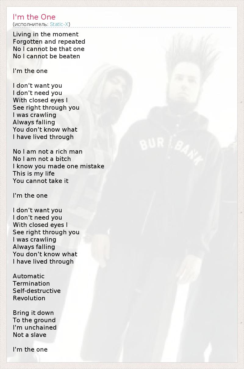 Living in the moment Forgotten and repeated No I cannot be that one No I cannot be beaten I'm the one I don't want you I don't need you With closed eyes I See right through you I was crawling Always falling You don't know what I have lived through No I am not a rich man No I am not a bitch I know you made one mistake This is my life You cannot take it I'm the one I don't want you I don't need you With closed eyes I See right through you I was crawling Always falling You don't know what I have lived through Automatic Termination Self-destructive Revolution Bring it down To the ground I'm unchained Not a slave I'm the one