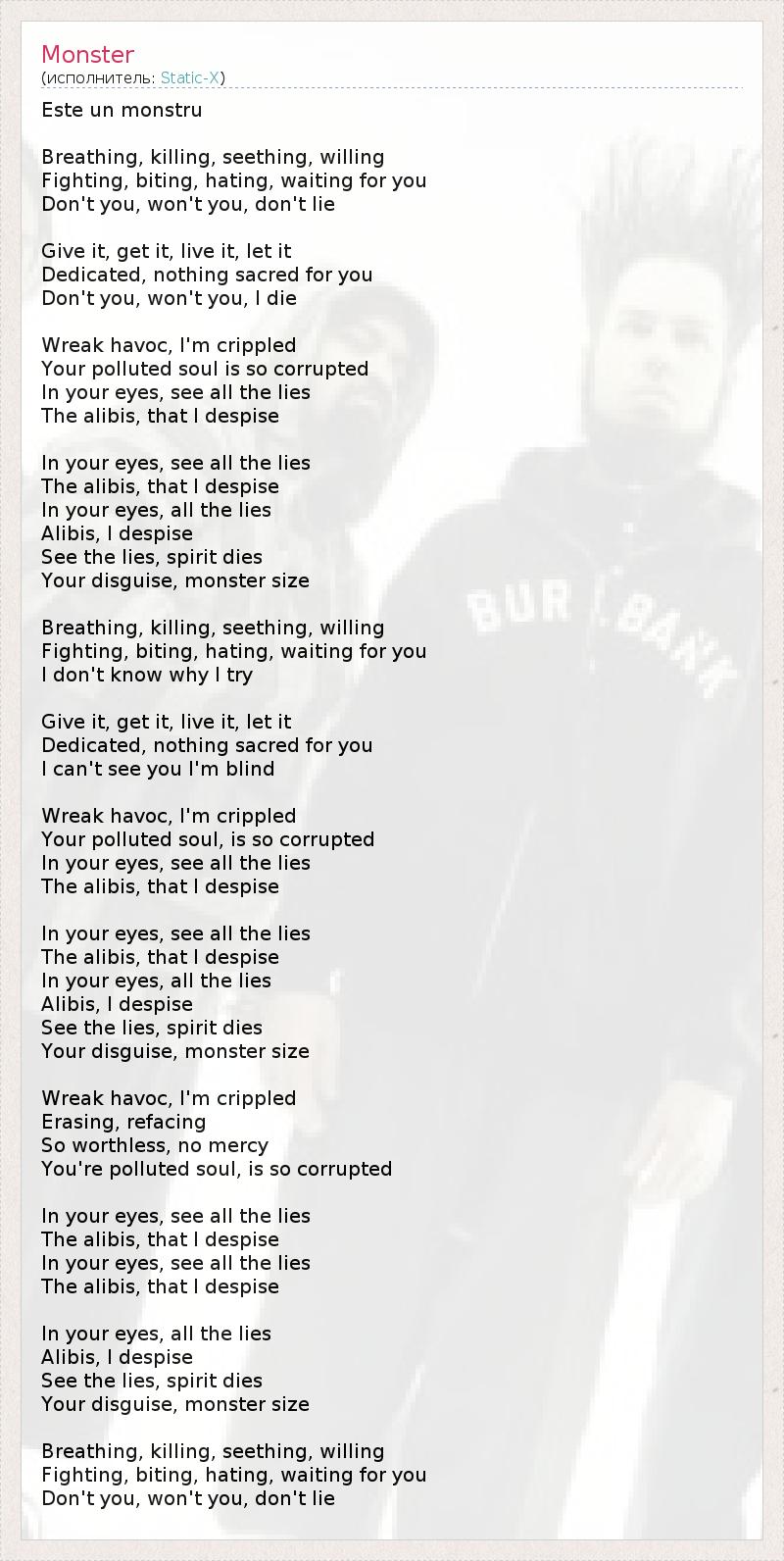 Это монстр! Дышу, убиваю, закипаю, желаю, Сражаюсь, кусаю, ненавижу, жду тебя, Не лги, не лги, не лги! Отдай, получи, живи, отпусти, Преданный, ничего святого, Нет, не делай этого, я умираю! Дай выход разрушению, я покалечен, Твоя грязная душа настолько развращена, В твоих глазах я вижу ложь, Оправдания, которые я презираю! В твоих глазах я вижу ложь, Оправдания, которые я презираю! В твоих глазах вся ложь, Оправдания, которые я презираю! Вижу ложь, дух погибает, Твоё притворство – размером с монстра. Дышу, убиваю, закипаю, желаю, Сражаюсь, кусаю, ненавижу, жду тебя, Не знаю, почему пытаюсь. Отдай, получи, живи, отпусти, Преданный, ничего святого, Нет, не делай этого, я умираю! Дай выход разрушению, я покалечен, Твоя грязная душа настолько развращена, В твоих глазах я вижу ложь, Оправдания, которые я презираю! В твоих глазах я вижу ложь, Оправдания, которые я презираю! В твоих глазах вся ложь, Оправдания, которые я презираю! Вижу ложь, дух погибает, Твоё притворство – размером с монстра. Дай выход разрушению, я покалечен, Стираю, меняю лицо, Такой бесполезный, без жалости, Твоя грязная душа настолько развращена... В твоих глазах я вижу ложь, Оправдания, которые я презираю! В твоих глазах я вижу ложь, Оправдания, которые я презираю! В твоих глазах вся ложь, Оправдания, которые я презираю! Вижу ложь, дух погибает, Твоё притворство – размером с монстра. Дышу, убиваю, закипаю, желаю, Сражаюсь, кусаю, ненавижу, жду тебя, Не лги, не лги, не лги!