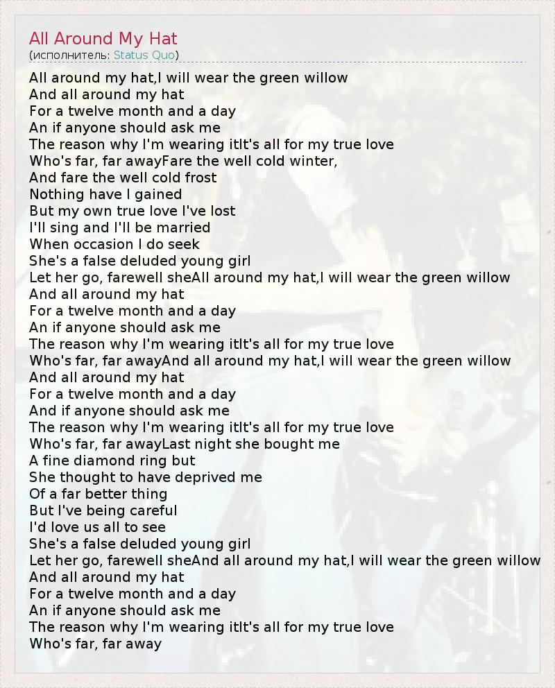 All around my hat,I will wear the green willow And all around my hat For a twelve month and a day An if anyone should ask me The reason why I'm wearing itIt's all for my true love Who's far, far awayFare the well cold winter, And fare the well cold frost Nothing have I gained But my own true love I've lost I'll sing and I'll be married When occasion I do seek She's a false deluded young girl Let her go, farewell sheAll around my hat,I will wear the green willow And all around my hat For a twelve month and a day An if anyone should ask me The reason why I'm wearing itIt's all for my true love Who's far, far awayAnd all around my hat,I will wear the green willow And all around my hat For a twelve month and a day And if anyone should ask me The reason why I'm wearing itIt's all for my true love Who's far, far awayLast night she bought me A fine diamond ring but She thought to have deprived me Of a far better thing But I've being careful I'd love us all to see She's a false deluded young girl Let her go, farewell sheAnd all around my hat,I will wear the green willow And all around my hat For a twelve month and a day An if anyone should ask me The reason why I'm wearing itIt's all for my true love Who's far, far away