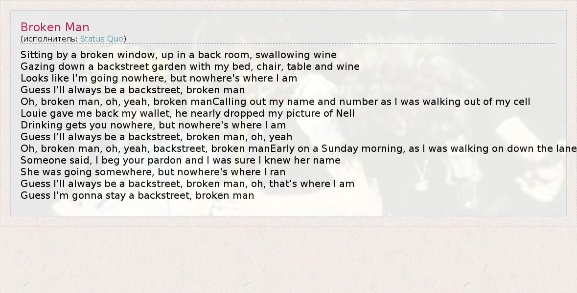 Sitting by a broken window, up in a back room, swallowing wine Gazing down a backstreet garden with my bed, chair, table and wine Looks like I'm going nowhere, but nowhere's where I am Guess I'll always be a backstreet, broken man Oh, broken man, oh, yeah, broken manCalling out my name and number as I was walking out of my cell Louie gave me back my wallet, he nearly dropped my picture of Nell Drinking gets you nowhere, but nowhere's where I am Guess I'll always be a backstreet, broken man, oh, yeah Oh, broken man, oh, yeah, backstreet, broken manEarly on a Sunday morning, as I was walking on down the lane Someone said, I beg your pardon and I was sure I knew her name She was going somewhere, but nowhere's where I ran Guess I'll always be a backstreet, broken man, oh, that's where I am Guess I'm gonna stay a backstreet, broken man