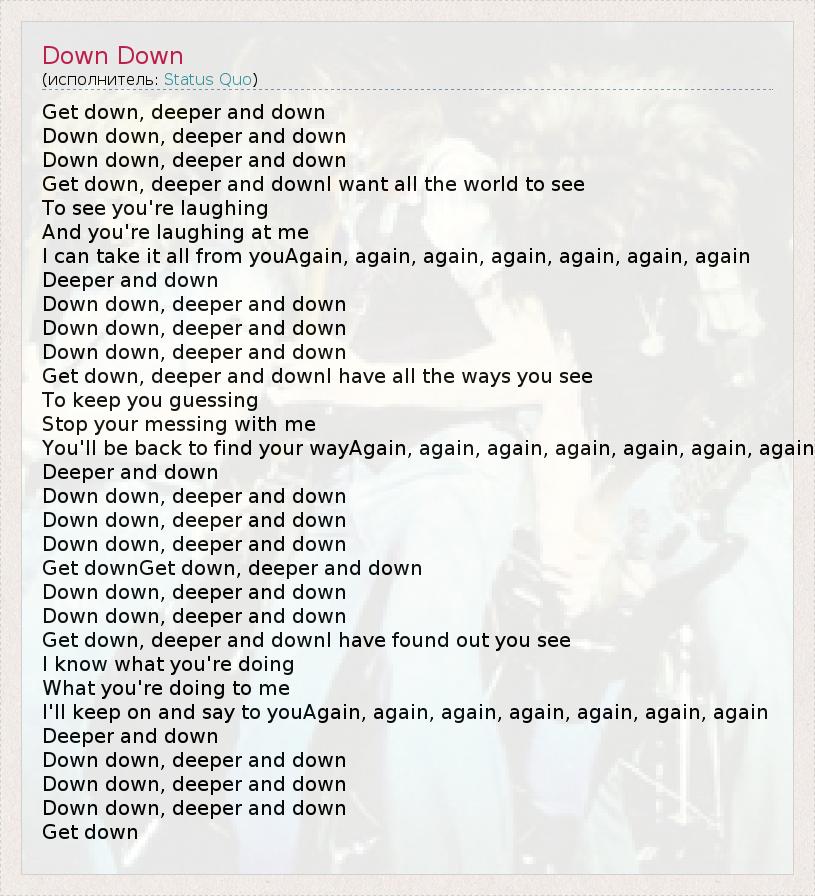 Get down, deeper and down Down down, deeper and down Down down, deeper and down Get down, deeper and downI want all the world to see To see you're laughing And you're laughing at me I can take it all from youAgain, again, again, again, again, again, again Deeper and down Down down, deeper and down Down down, deeper and down Down down, deeper and down Get down, deeper and downI have all the ways you see To keep you guessing Stop your messing with me You'll be back to find your wayAgain, again, again, again, again, again, again Deeper and down Down down, deeper and down Down down, deeper and down Down down, deeper and down Get downGet down, deeper and down Down down, deeper and down Down down, deeper and down Get down, deeper and downI have found out you see I know what you're doing What you're doing to me I'll keep on and say to youAgain, again, again, again, again, again, again Deeper and down Down down, deeper and down Down down, deeper and down Down down, deeper and down Get down