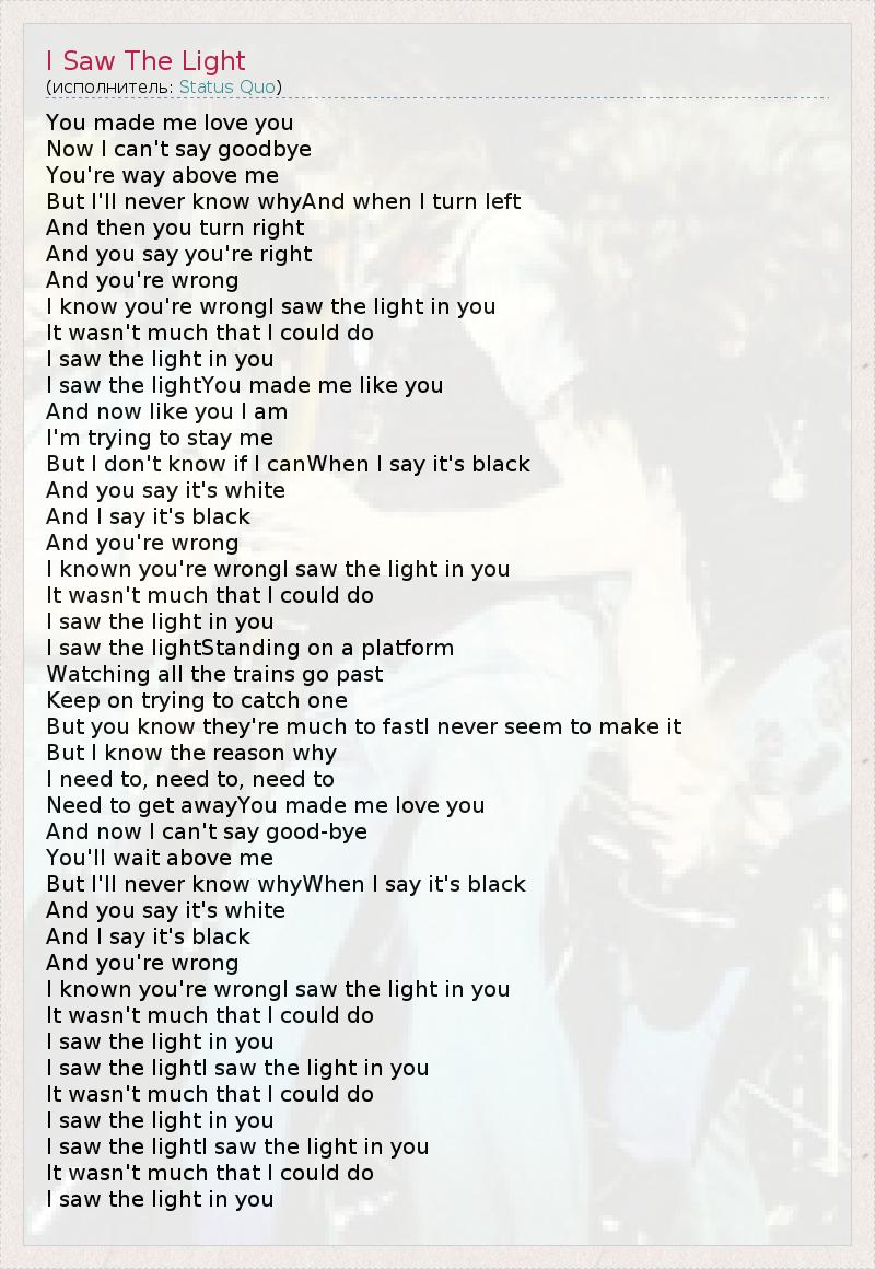 You made me love you Now I can't say goodbye You're way above me But I'll never know whyAnd when I turn left And then you turn right And you say you're right And you're wrong I know you're wrongI saw the light in you It wasn't much that I could do I saw the light in you I saw the lightYou made me like you And now like you I am I'm trying to stay me But I don't know if I canWhen I say it's black And you say it's white And I say it's black And you're wrong I known you're wrongI saw the light in you It wasn't much that I could do I saw the light in you I saw the lightStanding on a platform Watching all the trains go past Keep on trying to catch one But you know they're much to fastI never seem to make it But I know the reason why I need to, need to, need to Need to get awayYou made me love you And now I can't say good-bye You'll wait above me But I'll never know whyWhen I say it's black And you say it's white And I say it's black And you're wrong I known you're wrongI saw the light in you It wasn't much that I could do I saw the light in you I saw the lightI saw the light in you It wasn't much that I could do I saw the light in you I saw the lightI saw the light in you It wasn't much that I could do I saw the light in you