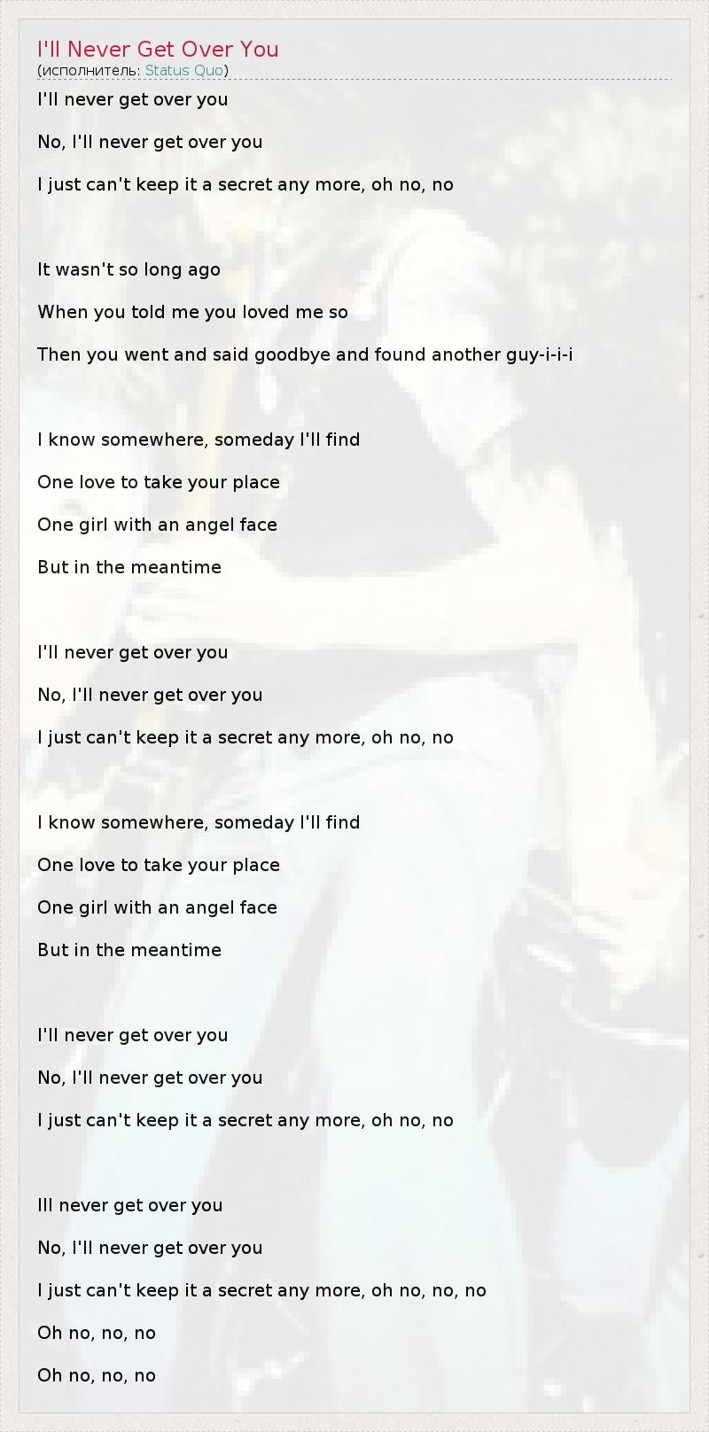 I'll never get over you No, I'll never get over you I just can't keep it a secret any more, oh no, no It wasn't so long ago When you told me you loved me so Then you went and said goodbye and found another guy-i-i-i I know somewhere, someday I'll find One love to take your place One girl with an angel face But in the meantime I'll never get over you No, I'll never get over you I just can't keep it a secret any more, oh no, no I know somewhere, someday I'll find One love to take your place One girl with an angel face But in the meantime I'll never get over you No, I'll never get over you I just can't keep it a secret any more, oh no, no Ill never get over you No, I'll never get over you I just can't keep it a secret any more, oh no, no, no Oh no, no, no Oh no, no, no