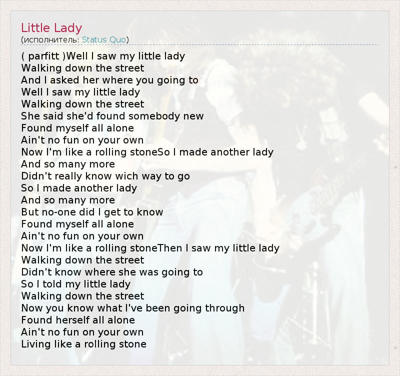 ( parfitt )Well I saw my little lady Walking down the street And I asked her where you going to Well I saw my little lady Walking down the street She said she'd found somebody new Found myself all alone Ain't no fun on your own Now I'm like a rolling stoneSo I made another lady And so many more Didn't really know wich way to go So I made another lady And so many more But no-one did I get to know Found myself all alone Ain't no fun on your own Now I'm like a rolling stoneThen I saw my little lady Walking down the street Didn't know where she was going to So I told my little lady Walking down the street Now you know what I've been going through Found herself all alone Ain't no fun on your own Living like a rolling stone