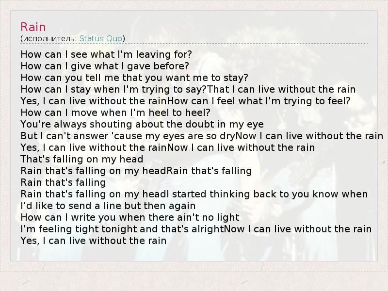 How can I see what I'm leaving for? How can I give what I gave before? How can you tell me that you want me to stay? How can I stay when I'm trying to say?That I can live without the rain Yes, I can live without the rainHow can I feel what I'm trying to feel? How can I move when I'm heel to heel? You're always shouting about the doubt in my eye But I can't answer 'cause my eyes are so dryNow I can live without the rain Yes, I can live without the rainNow I can live without the rain That's falling on my head Rain that's falling on my headRain that's falling Rain that's falling Rain that's falling on my headI started thinking back to you know when I'd like to send a line but then again How can I write you when there ain't no light I'm feeling tight tonight and that's alrightNow I can live without the rain Yes, I can live without the rain