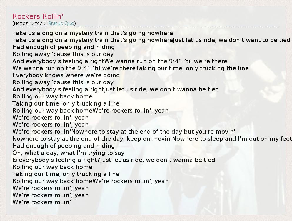 Take us along on a mystery train that's going nowhere Take us along on a mystery train that's going nowhereJust let us ride, we don't want to be tied Had enough of peeping and hiding Rolling away 'cause this is our day And everybody's feeling alrightWe wanna run on the 9:41 'til we're there We wanna run on the 9:41 'til we're thereTaking our time, only trucking the line Everybody knows where we're going Rolling away 'cause this is our day And everybody's feeling alrightJust let us ride, we don't wanna be tied Rolling our way back home Taking our time, only trucking a line Rolling our way back homeWe're rockers rollin', yeah We're rockers rollin', yeah We're rockers rollin', yeah We're rockers rollin'Nowhere to stay at the end of the day but you're movin' Nowhere to stay at the end of the day, keep on movin'Nowhere to sleep and I'm out on my feet Had enough of peeping and hiding Oh, what a day, what I'm trying to say Is everybody's feeling alright?Just let us ride, we don't wanna be tied Rolling our way back home Taking our time, only trucking a line Rolling our way back homeWe're rockers rollin', yeah We're rockers rollin', yeah We're rockers rollin', yeah We're rockers rollin'