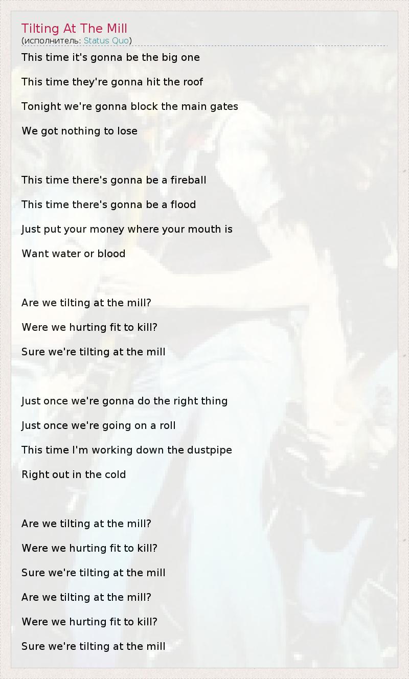 This time it's gonna be the big one This time they're gonna hit the roof Tonight we're gonna block the main gates We got nothing to lose This time there's gonna be a fireball This time there's gonna be a flood Just put your money where your mouth is Want water or blood Are we tilting at the mill? Were we hurting fit to kill? Sure we're tilting at the mill Just once we're gonna do the right thing Just once we're going on a roll This time I'm working down the dustpipe Right out in the cold Are we tilting at the mill? Were we hurting fit to kill? Sure we're tilting at the mill Are we tilting at the mill? Were we hurting fit to kill? Sure we're tilting at the mill