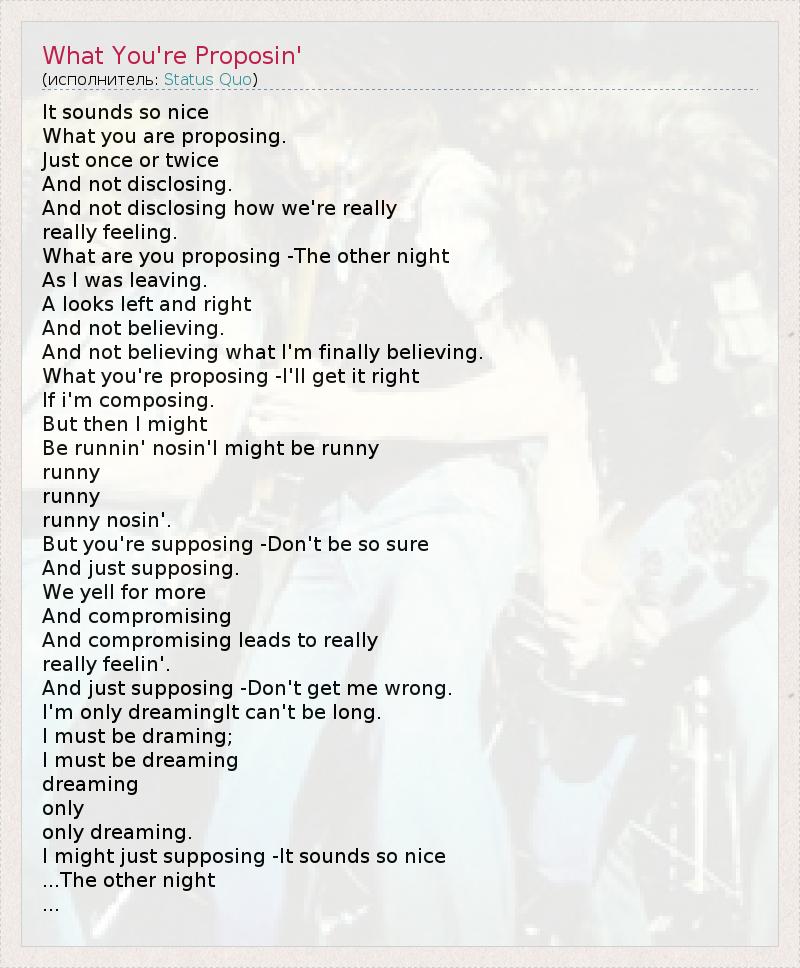 It sounds so nice What you are proposing. Just once or twice And not disclosing. And not disclosing how we're really really feeling. What are you proposing -The other night As I was leaving. A looks left and right And not believing. And not believing what I'm finally believing. What you're proposing -I'll get it right If i'm composing. But then I might Be runnin' nosin'I might be runny runny runny runny nosin'. But you're supposing -Don't be so sure And just supposing. We yell for more And compromising And compromising leads to really really feelin'. And just supposing -Don't get me wrong. I'm only dreamingIt can't be long. I must be draming; I must be dreaming dreaming only only dreaming. I might just supposing -It sounds so nice ...The other night ...