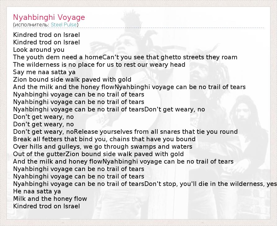 Nyahbinghi voyage can be no trail of tearsDon't get weary, no