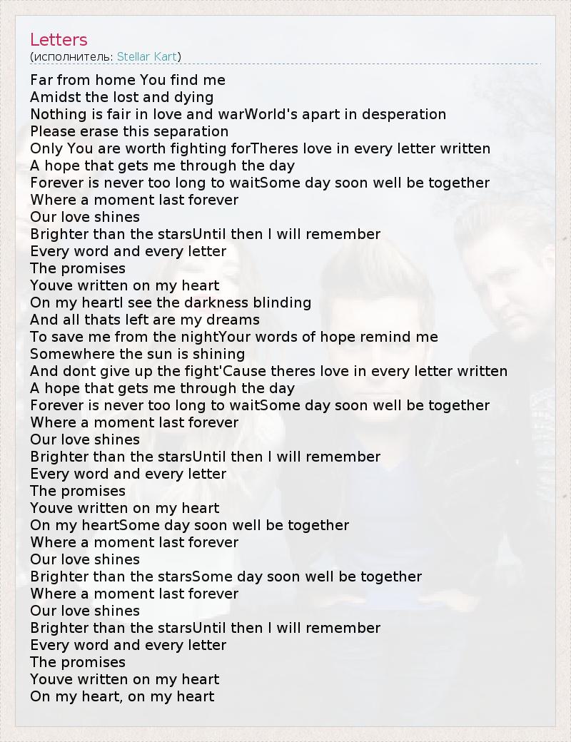 Far from home You find me Amidst the lost and dying Nothing is fair in love and warWorld's apart in desperation Please erase this separation Only You are worth fighting forTheres love in every letter written A hope that gets me through the day Forever is never too long to waitSome day soon well be together Where a moment last forever Our love shines Brighter than the starsUntil then I will remember Every word and every letter The promises Youve written on my heart On my heartI see the darkness blinding And all thats left are my dreams To save me from the nightYour words of hope remind me Somewhere the sun is shining And dont give up the fight'Cause theres love in every letter written A hope that gets me through the day Forever is never too long to waitSome day soon well be together Where a moment last forever Our love shines Brighter than the starsUntil then I will remember Every word and every letter The promises Youve written on my heart On my heartSome day soon well be together Where a moment last forever Our love shines Brighter than the starsSome day soon well be together Where a moment last forever Our love shines Brighter than the starsUntil then I will remember Every word and every letter The promises Youve written on my heart On my heart, on my heart