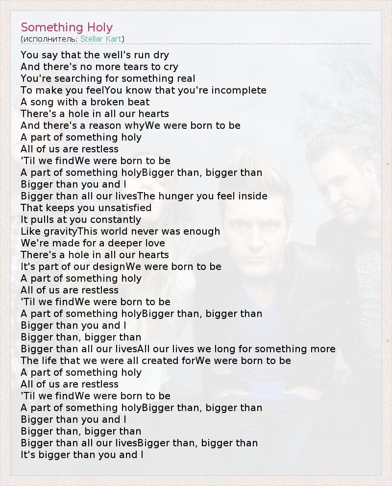 You say that the well's run dry And there's no more tears to cry You're searching for something real To make you feelYou know that you're incomplete A song with a broken beat There's a hole in all our hearts And there's a reason whyWe were born to be A part of something holy All of us are restless 'Til we findWe were born to be A part of something holyBigger than, bigger than Bigger than you and I Bigger than all our livesThe hunger you feel inside That keeps you unsatisfied It pulls at you constantly Like gravityThis world never was enough We're made for a deeper love There's a hole in all our hearts It's part of our designWe were born to be A part of something holy All of us are restless 'Til we findWe were born to be A part of something holyBigger than, bigger than Bigger than you and I Bigger than, bigger than Bigger than all our livesAll our lives we long for something more The life that we were all created forWe were born to be A part of something holy All of us are restless 'Til we findWe were born to be A part of something holyBigger than, bigger than Bigger than you and I Bigger than, bigger than Bigger than all our livesBigger than, bigger than It's bigger than you and I