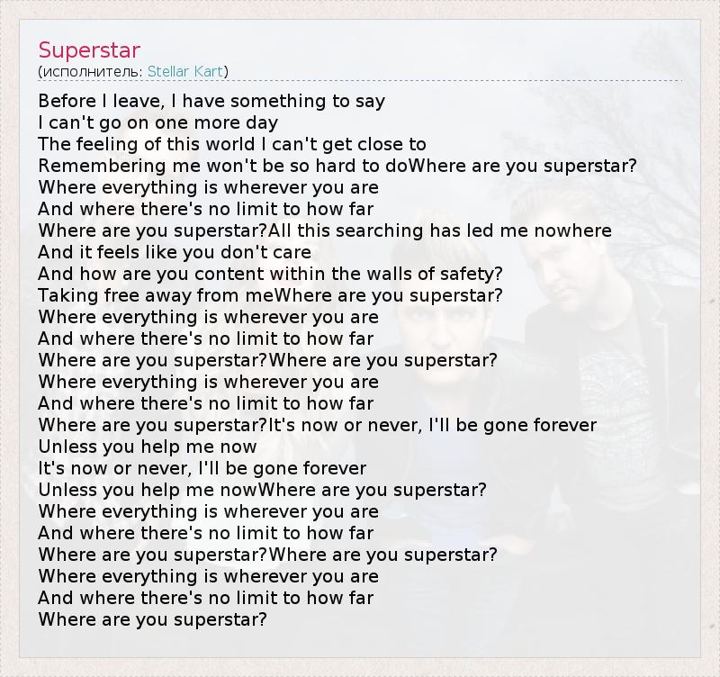 Before I leave, I have something to say I can't go on one more day The feeling of this world I can't get close to Remembering me won't be so hard to doWhere are you superstar? Where everything is wherever you are And where there's no limit to how far Where are you superstar?All this searching has led me nowhere And it feels like you don't care And how are you content within the walls of safety? Taking free away from meWhere are you superstar? Where everything is wherever you are And where there's no limit to how far Where are you superstar?Where are you superstar? Where everything is wherever you are And where there's no limit to how far Where are you superstar?It's now or never, I'll be gone forever Unless you help me now It's now or never, I'll be gone forever Unless you help me nowWhere are you superstar? Where everything is wherever you are And where there's no limit to how far Where are you superstar?Where are you superstar? Where everything is wherever you are And where there's no limit to how far Where are you superstar?