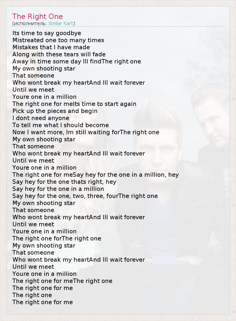 Its time to say goodbye Mistreated one too many times Mistakes that I have made Along with these tears will fade Away in time some day Ill findThe right one My own shooting star That someone Who wont break my heartAnd Ill wait forever Until we meet Youre one in a million The right one for meIts time to start again Pick up the pieces and begin I dont need anyone To tell me what I should become Now I want more, Im still waiting forThe right one My own shooting star That someone Who wont break my heartAnd Ill wait forever Until we meet Youre one in a million The right one for meSay hey for the one in a million, hey Say hey for the one thats right, hey Say hey for the one in a million Say hey for the one, two, three, fourThe right one My own shooting star That someone Who wont break my heartAnd Ill wait forever Until we meet Youre one in a million The right one forThe right one My own shooting star That someone Who wont break my heartAnd Ill wait forever Until we meet Youre one in a million The right one for meThe right one The right one for me The right one The right one for me