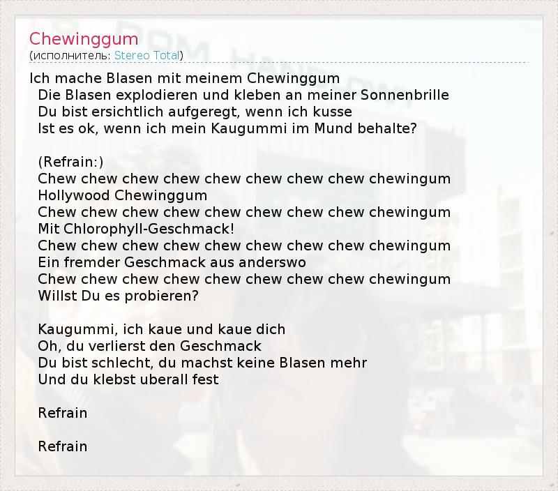 Ich mache Blasen mit meinem Chewinggum Die Blasen explodieren und kleben an meiner Sonnenbrille Du bist ersichtlich aufgeregt, wenn ich kusse Ist es ok, wenn ich mein Kaugummi im Mund behalte? (Refrain:) Chew chew chew chew chew chew chew chew chewingum Hollywood Chewinggum Chew chew chew chew chew chew chew chew chewingum Mit Chlorophyll-Geschmack! Chew chew chew chew chew chew chew chew chewingum Ein fremder Geschmack aus anderswo Chew chew chew chew chew chew chew chew chewingum Willst Du es probieren? Kaugummi, ich kaue und kaue dich Oh, du verlierst den Geschmack Du bist schlecht, du machst keine Blasen mehr Und du klebst uberall fest Refrain Refrain