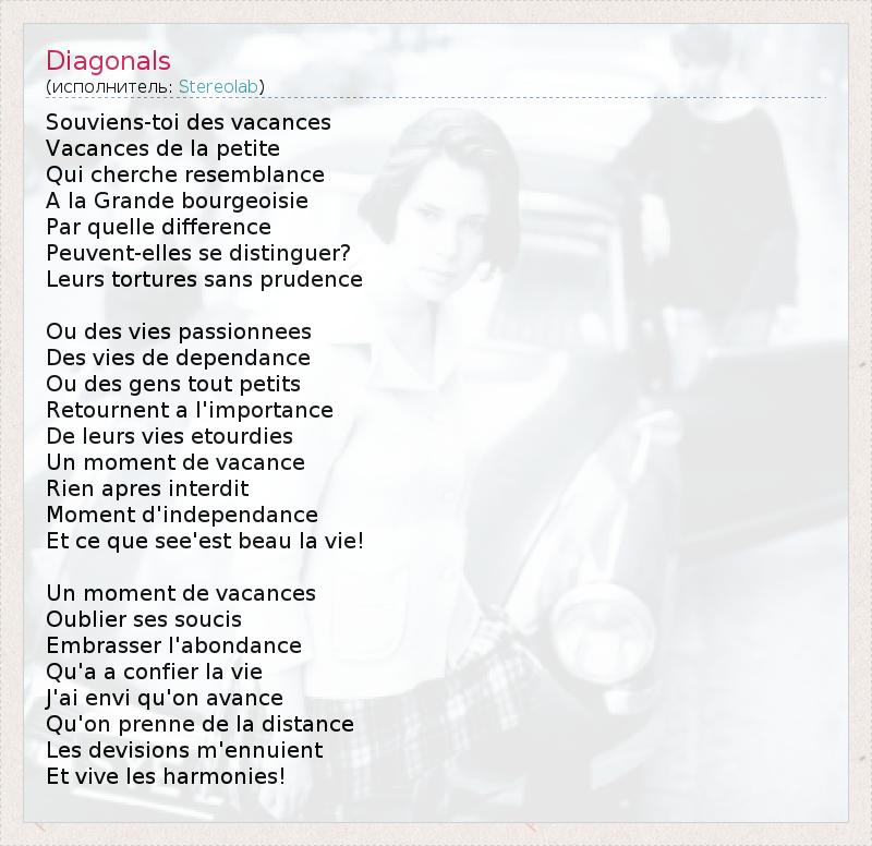 Souviens-toi des vacances Vacances de la petite Qui cherche resemblance A la Grande bourgeoisie Par quelle difference Peuvent-elles se distinguer? Leurs tortures sans prudence Ou des vies passionnees Des vies de dependance Ou des gens tout petits Retournent a l'importance De leurs vies etourdies Un moment de vacance Rien apres interdit Moment d'independance Et ce que see'est beau la vie! Un moment de vacances Oublier ses soucis Embrasser l'abondance Qu'a a confier la vie J'ai envi qu'on avance Qu'on prenne de la distance Les devisions m'ennuient Et vive les harmonies!
