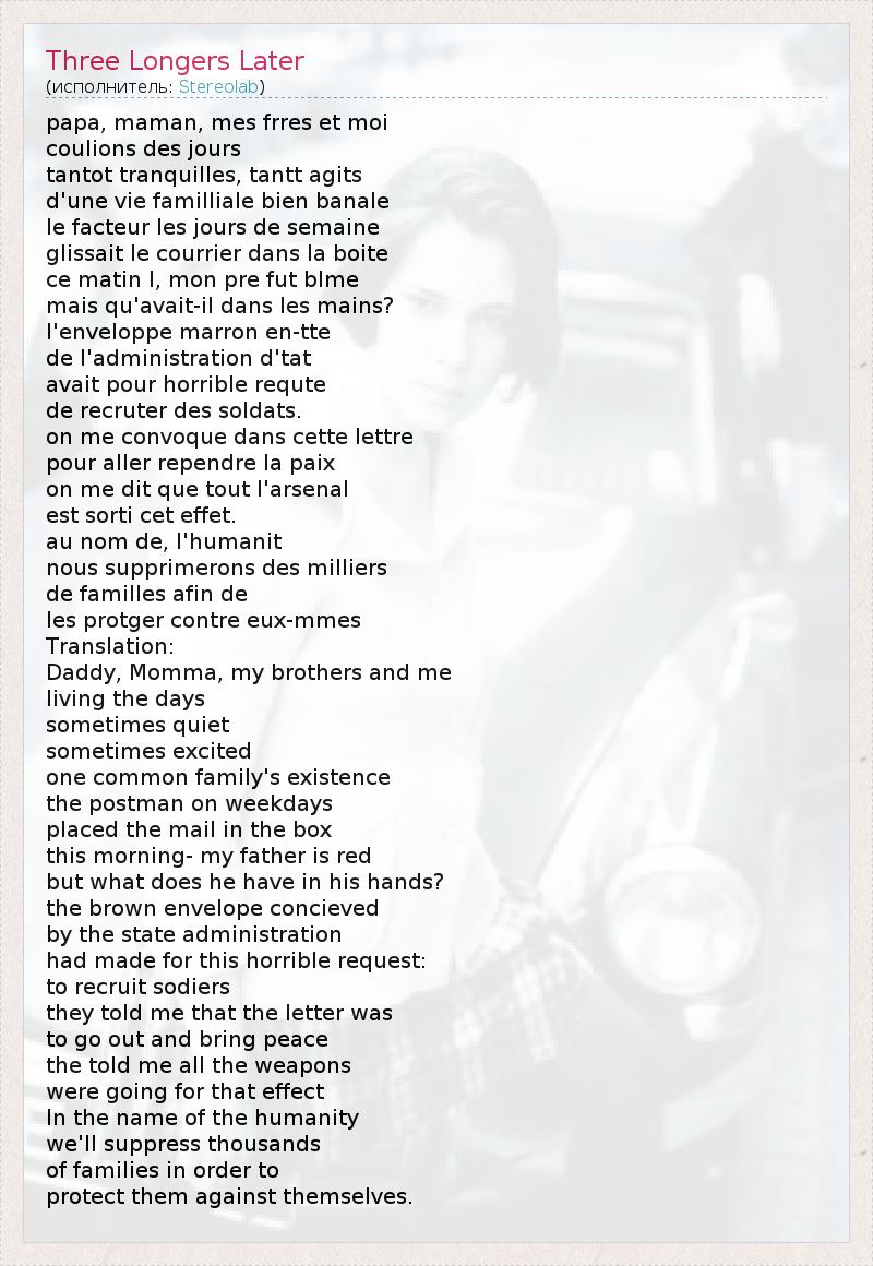 papa, maman, mes frres et moi coulions des jours tantot tranquilles, tantt agits d'une vie familliale bien banale le facteur les jours de semaine glissait le courrier dans la boite ce matin l, mon pre fut blme mais qu'avait-il dans les mains? l'enveloppe marron en-tte de l'administration d'tat avait pour horrible requte de recruter des soldats. on me convoque dans cette lettre pour aller rependre la paix on me dit que tout l'arsenal est sorti cet effet. au nom de, l'humanit nous supprimerons des milliers de familles afin de les protger contre eux-mmes Translation: Daddy, Momma, my brothers and me living the days sometimes quiet sometimes excited one common family's existence the postman on weekdays placed the mail in the box this morning- my father is red but what does he have in his hands? the brown envelope concieved by the state administration had made for this horrible request: to recruit sodiers they told me that the letter was to go out and bring peace the told me all the weapons were going for that effect In the name of the humanity we'll suppress thousands of families in order to protect them against themselves.