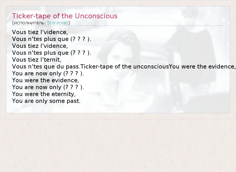 Vous tiez l'vidence, Vous n'tes plus que (? ? ? ). Vous tiez l'vidence, Vous n'tes plus que (? ? ? ). Vous tiez l'ternit, Vous n'tes que du pass.Ticker-tape of the unconsciousYou were the evidence, You are now only (? ? ? ). You were the evidence, You are now only (? ? ? ). You were the eternity, You are only some past.