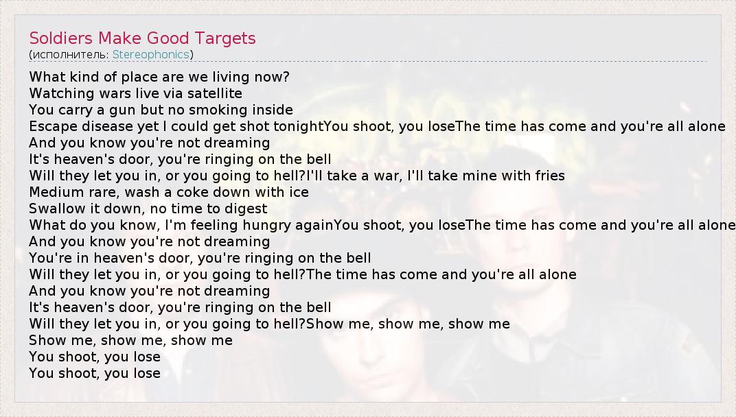 А как ты думаешь, о чем песня "Soldiers Make Good Targets" ?