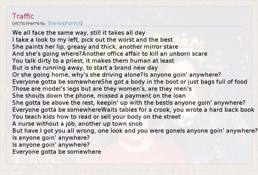 Or she going home, why's she driving alone?Is anyone goin' anywhere?