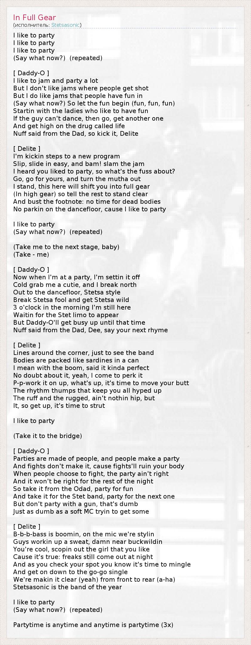 I like to party I like to party I like to party (Say what now?) (repeated) [ Daddy-O ] I like to jam and party a lot But I don't like jams where people get shot But I do like jams that people have fun in (Say what now?) So let the fun begin (fun, fun, fun) Startin with the ladies who like to have fun If the guy can't dance, then go, get another one And get high on the drug called life Nuff said from the Dad, so kick it, Delite [ Delite ] I'm kickin steps to a new program Slip, slide in easy, and bam! slam the jam I heard you liked to party, so what's the fuss about? Go, go for yours, and turn the mutha out I stand, this here will shift you into full gear (In high gear) so tell the rest to stand clear And bust the footnote: no time for dead bodies No parkin on the dancefloor, cause I like to party I like to party (Say what now?) (repeated) (Take me to the next stage, baby) (Take - me) [ Daddy-O ] Now when I'm at a party, I'm settin it off Cold grab me a cutie, and I break north Out to the dancefloor, Stetsa style Break Stetsa fool and get Stetsa wild 3 o'clock in the morning I'm still here Waitin for the Stet limo to appear But Daddy-O'll get busy up until that time Nuff said from the Dad, Dee, say your next rhyme [ Delite ] Lines around the corner, just to see the band Bodies are packed like sardines in a can I mean with the boom, said it kinda perfect No doubt about it, yeah, I come to perk it P-p-work it on up, what's up, it's time to move your butt The rhythm thumps that keep you all hyped up The ruff and the rugged, ain't nothin hip, but It, so get up, it's time to strut I like to party (Take it to the bridge) [ Daddy-O ] Parties are made of people, and people make a party And fights don't make it, cause fights'll ruin your body When people choose to fight, the party ain't right And it won't be right for the rest of the night So take it from the Odad, party for fun And take it for the Stet band, party for the next one But don't party with a gun, that's dumb Just as dumb as a soft MC tryin to get some [ Delite ] B-b-b-bass is boomin, on the mic we're stylin Guys workin up a sweat, damn near buckwildin You're cool, scopin out the girl that you like Cause it's true: freaks still come out at night And as you check your spot you know it's time to mingle And get on down to the go-go single We're makin it clear (yeah) from front to rear (a-ha) Stetsasonic is the band of the year I like to party (Say what now?) (repeated) Partytime is anytime and anytime is partytime (3x)