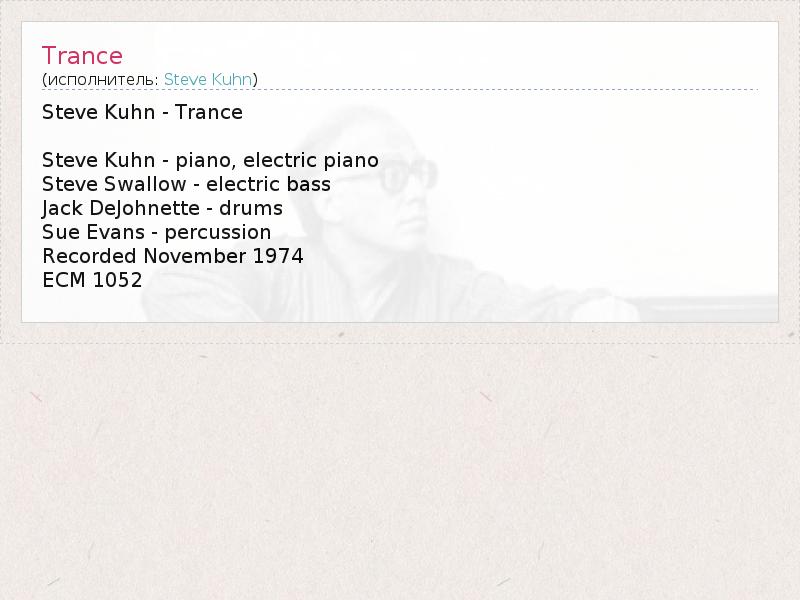 Это интересно:24.03.1938, Нью-ЙоркПианист. Получил классическое музыкальное образование у Маргарет Чалофф (матери известного саксофониста). В 1956–59 учился в Гарвардском университете, в 1959 — в джазовой школе в Леноксе (шт. Массачусетс) на одном курсе с Орнеттом Коулменом и Гэри МакПатлендом. Стал известен, выступая в ансамблях Кенни Дорэма и Джона Колтрейна. В 60-е годы играл в основном в клубах Бостона,... продолжение