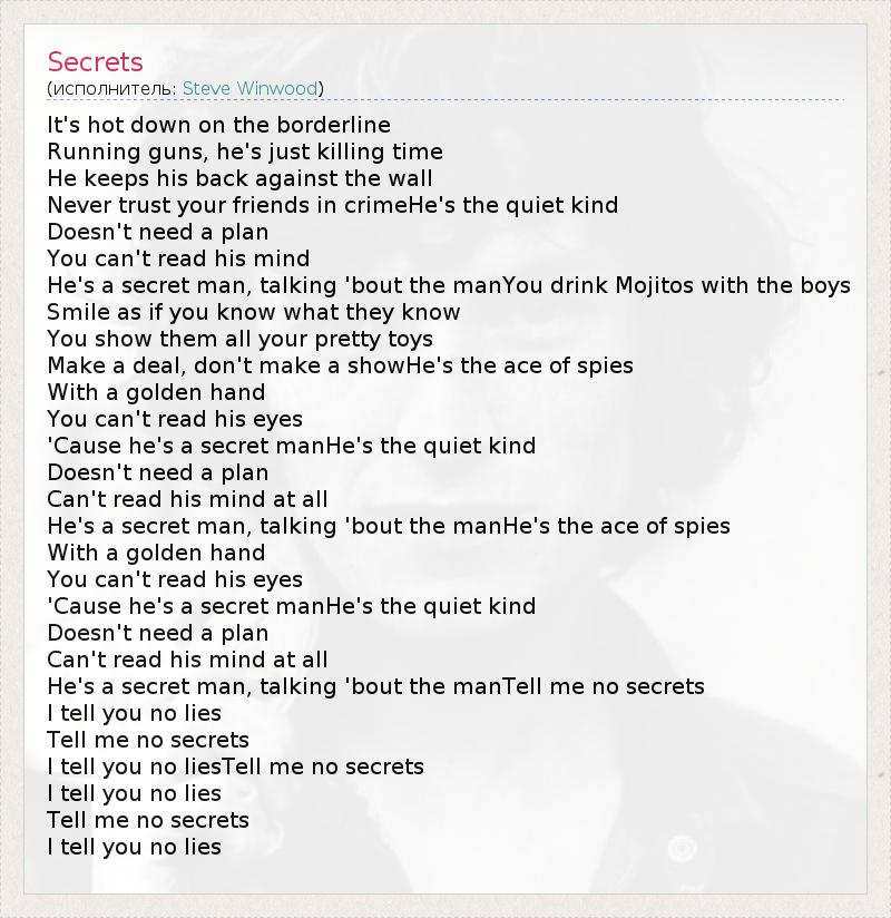 It's hot down on the borderline Running guns, he's just killing time He keeps his back against the wall Never trust your friends in crimeHe's the quiet kind Doesn't need a plan You can't read his mind He's a secret man, talking 'bout the manYou drink Mojitos with the boys Smile as if you know what they know You show them all your pretty toys Make a deal, don't make a showHe's the ace of spies With a golden hand You can't read his eyes 'Cause he's a secret manHe's the quiet kind Doesn't need a plan Can't read his mind at all He's a secret man, talking 'bout the manHe's the ace of spies With a golden hand You can't read his eyes 'Cause he's a secret manHe's the quiet kind Doesn't need a plan Can't read his mind at all He's a secret man, talking 'bout the manTell me no secrets I tell you no lies Tell me no secrets I tell you no liesTell me no secrets I tell you no lies Tell me no secrets I tell you no lies