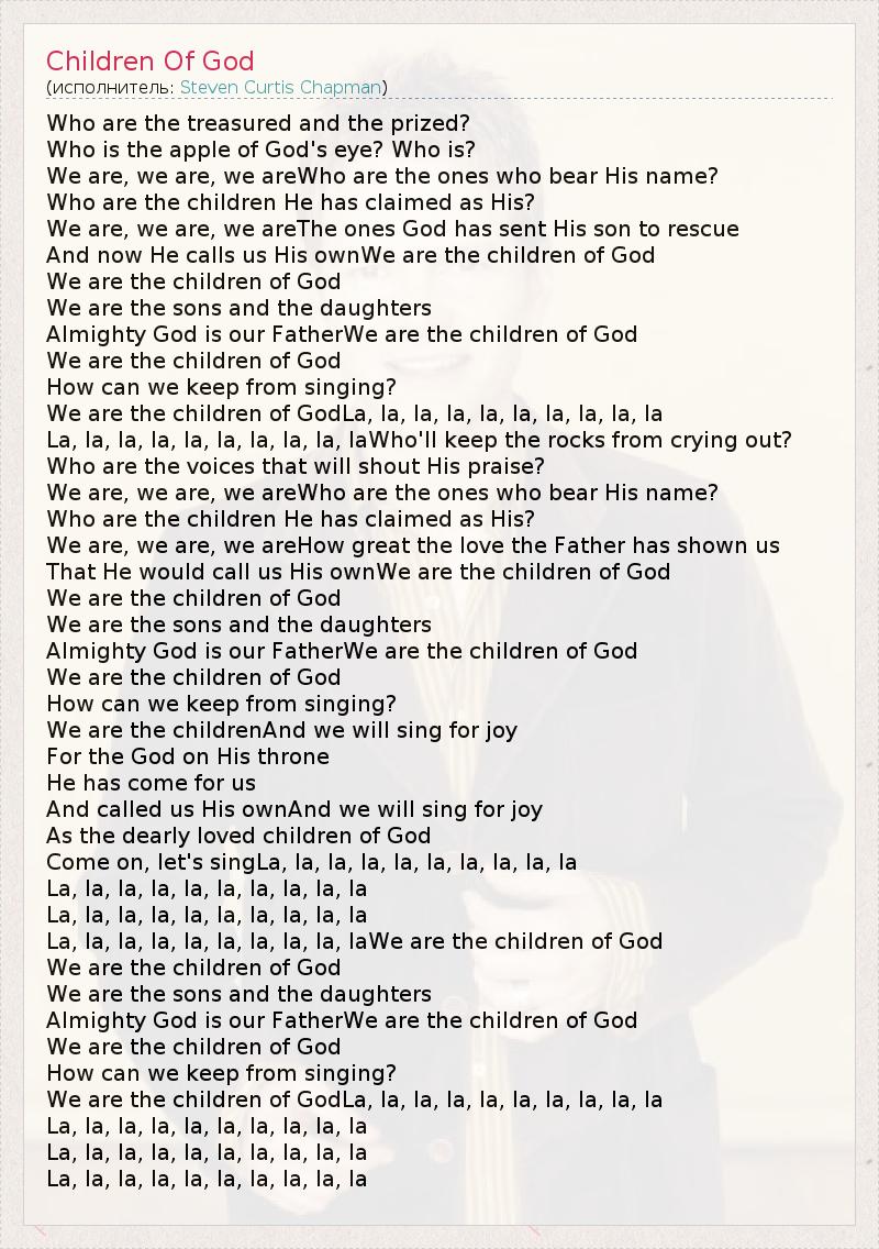 Who are the treasured and the prized? Who is the apple of God's eye? Who is? We are, we are, we areWho are the ones who bear His name? Who are the children He has claimed as His? We are, we are, we areThe ones God has sent His son to rescue And now He calls us His ownWe are the children of God We are the children of God We are the sons and the daughters Almighty God is our FatherWe are the children of God We are the children of God How can we keep from singing? We are the children of GodLa, la, la, la, la, la, la, la, la, la La, la, la, la, la, la, la, la, la, laWho'll keep the rocks from crying out? Who are the voices that will shout His praise? We are, we are, we areWho are the ones who bear His name? Who are the children He has claimed as His? We are, we are, we areHow great the love the Father has shown us That He would call us His ownWe are the children of God We are the children of God We are the sons and the daughters Almighty God is our FatherWe are the children of God We are the children of God How can we keep from singing? We are the childrenAnd we will sing for joy For the God on His throne He has come for us And called us His ownAnd we will sing for joy As the dearly loved children of God Come on, let's singLa, la, la, la, la, la, la, la, la, la La, la, la, la, la, la, la, la, la, la La, la, la, la, la, la, la, la, la, la La, la, la, la, la, la, la, la, la, laWe are the children of God We are the children of God We are the sons and the daughters Almighty God is our FatherWe are the children of God We are the children of God How can we keep from singing? We are the children of GodLa, la, la, la, la, la, la, la, la, la La, la, la, la, la, la, la, la, la, la La, la, la, la, la, la, la, la, la, la La, la, la, la, la, la, la, la, la, la