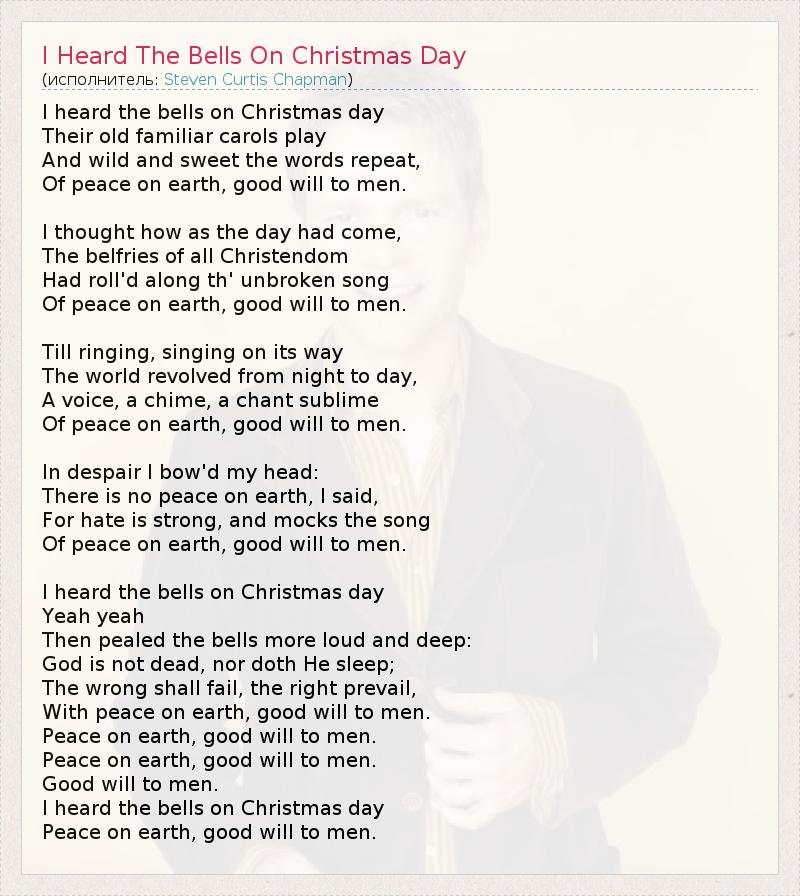 I heard the bells on Christmas day Their old familiar carols play And wild and sweet the words repeat, Of peace on earth, good will to men. I thought how as the day had come, The belfries of all Christendom Had roll'd along th' unbroken song Of peace on earth, good will to men. Till ringing, singing on its way The world revolved from night to day, A voice, a chime, a chant sublime Of peace on earth, good will to men. In despair I bow'd my head: There is no peace on earth, I said, For hate is strong, and mocks the song Of peace on earth, good will to men. I heard the bells on Christmas day Yeah yeah Then pealed the bells more loud and deep: God is not dead, nor doth He sleep; The wrong shall fail, the right prevail, With peace on earth, good will to men. Peace on earth, good will to men. Peace on earth, good will to men. Good will to men. I heard the bells on Christmas day Peace on earth, good will to men.