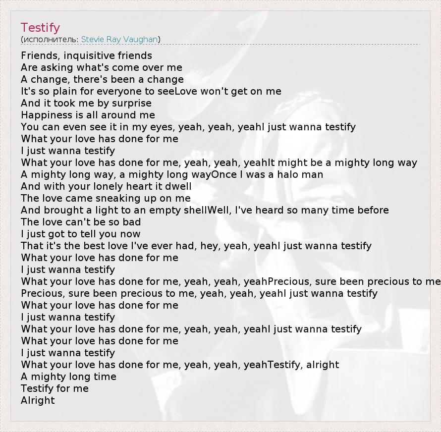 What your love has done for me, yeah, yeah, yeahTestify, alright