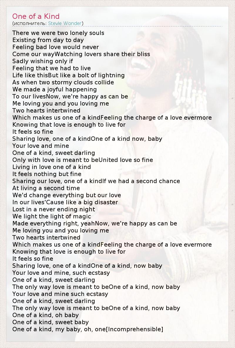 There we were two lonely souls Existing from day to day Feeling bad love would never Come our wayWatching lovers share their bliss Sadly wishing only if Feeling that we had to live Life like thisBut like a bolt of lightning As when two stormy clouds collide We made a joyful happening To our livesNow, we're happy as can be Me loving you and you loving me Two hearts intertwined Which makes us one of a kindFeeling the charge of a love evermore Knowing that love is enough to live for It feels so fine Sharing love, one of a kindOne of a kind now, baby Your love and mine One of a kind, sweet darling Only with love is meant to beUnited love so fine Living in love one of a kind It feels nothing but fine Sharing our love, one of a kindIf we had a second chance At living a second time We'd change everything but our love In our lives'Cause like a big disaster Lost in a never ending night We light the light of magic Made everything right, yeahNow, we're happy as can be Me loving you and you loving me Two hearts intertwined Which makes us one of a kindFeeling the charge of a love evermore Knowing that love is enough to live for It feels so fine Sharing love, one of a kindOne of a kind, now baby Your love and mine, such ecstasy One of a kind, sweet darling The only way love is meant to beOne of a kind, now baby Your love and mine such ecstasy One of a kind, sweet darling The only way love is meant to beOne of a kind, now baby One of a kind, oh baby One of a kind, sweet baby One of a kind, my baby, oh, one[Incomprehensible]