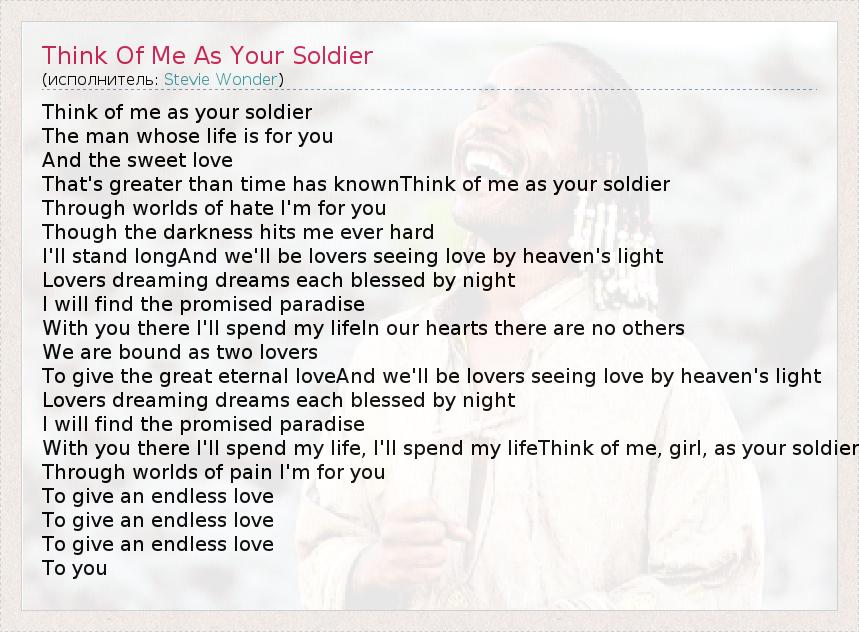 А как ты думаешь, о чем песня "Think Of Me As Your Soldier" ?