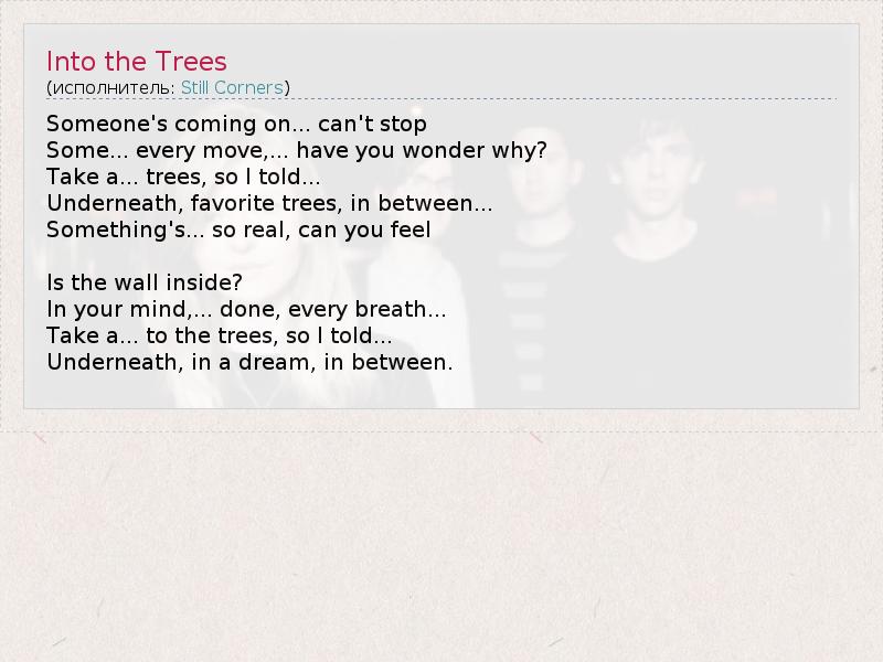 Someone's coming on... can't stop Some... every move,... have you wonder why? Take a... trees, so I told... Underneath, favorite trees, in between... Something's... so real, can you feel Is the wall inside? In your mind,... done, every breath... Take a... to the trees, so I told... Underneath, in a dream, in between.