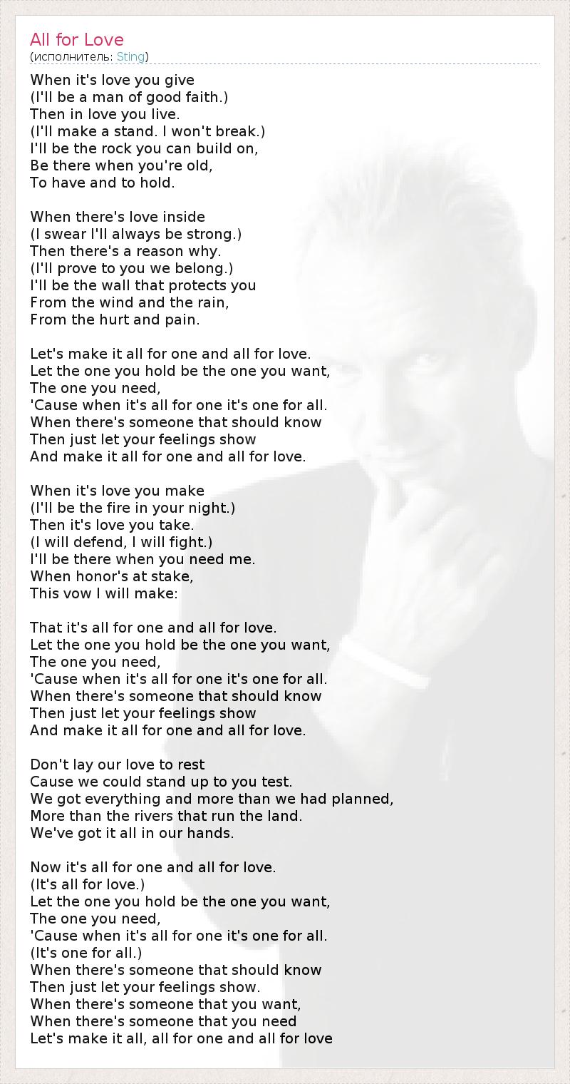 Когда ты даришь любовь, (Я буду человеком чести), Тогда любовь сопровождает тебя по жизни. (Я буду защищать. Меня не сломить.) Я буду крепким фундаментом, на котором ты сможешь строить, Буду рядом, когда ты постареешь, Чтобы иметь и дорожить. Когда внутри живёт любовь, (Я клянусь, я всегда буду сильным.) Тогда есть причина. (Я докажу тебе, мы единое целое.) Я буду стеной, которая защищает тебя От ветра и дождя, От обид и боли. Давайте сделаем это, все за одного, и всё ради любви. Пусть тот, с кем ты, будет единственным, кого ты хочешь, Единственным, кто тебе нужен, Потому что, когда все за одного - один за всех. Если есть кто-то, кто должен знать, Тогда просто расскажи о своих чувствах, И сделай это всё ради единственного и всё ради любви. Когда ты творишь любовь, (Я буду для тебя светом в ночи.) Тогда ты получаешь любовь. (Я буду защищать, я буду бороться.) Я буду рядом, когда ты нуждаешься во мне. Когда честь поставлена на карту, Я дам клятву: Все за одного и всё ради любви! Пусть тот, с кем ты, будет единственным, кого ты хочешь, Единственным, кто тебе нужен, Потому что, когда все за одного - один за всех. Если есть кто-то, кто должен знать, Тогда просто расскажи о своих чувствах, И сделай это всё ради единственного и всё ради любви. Не хорони нашу любовь, Потому что мы можем пройти испытание. У нас есть всё и даже более того, что мы задумывали, Больше, чем рек на земле, Это всё в наших руках. Сейчас все за одного и всё ради любви! (Всё ради любви.) Пусть тот, с кем ты, будет единственным, кого ты хочешь, Единственным, кто тебе нужен, Потому что, когда все за одного - один за всех. (Один за всех.) Если есть кто-то, кто должен знать, Тогда просто расскажи о своих чувствах, Если есть кто-то, кого ты хочешь, Если есть кто-то, кто тебе нужен, Давайте сделаем это всё, все за одного и всё ради любви.