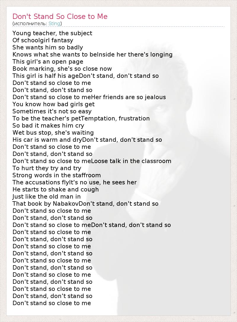 Young teacher, the subject Of schoolgirl fantasy She wants him so badly Knows what she wants to beInside her there's longing This girl's an open page Book marking, she's so close now This girl is half his ageDon't stand, don't stand so Don't stand so close to me Don't stand, don't stand so Don't stand so close to meHer friends are so jealous You know how bad girls get Sometimes it's not so easy To be the teacher's petTemptation, frustration So bad it makes him cry Wet bus stop, she's waiting His car is warm and dryDon't stand, don't stand so Don't stand so close to me Don't stand, don't stand so Don't stand so close to meLoose talk in the classroom To hurt they try and try Strong words in the staffroom The accusations flyIt's no use, he sees her He starts to shake and cough Just like the old man in That book by NabakovDon't stand, don't stand so Don't stand so close to me Don't stand, don't stand so Don't stand so close to meDon't stand, don't stand so Don't stand so close to me Don't stand, don't stand so Don't stand so close to me Don't stand, don't stand so Don't stand so close to me Don't stand, don't stand so Don't stand so close to me Don't stand, don't stand so Don't stand so close to me Don't stand, don't stand so Don't stand so close to me