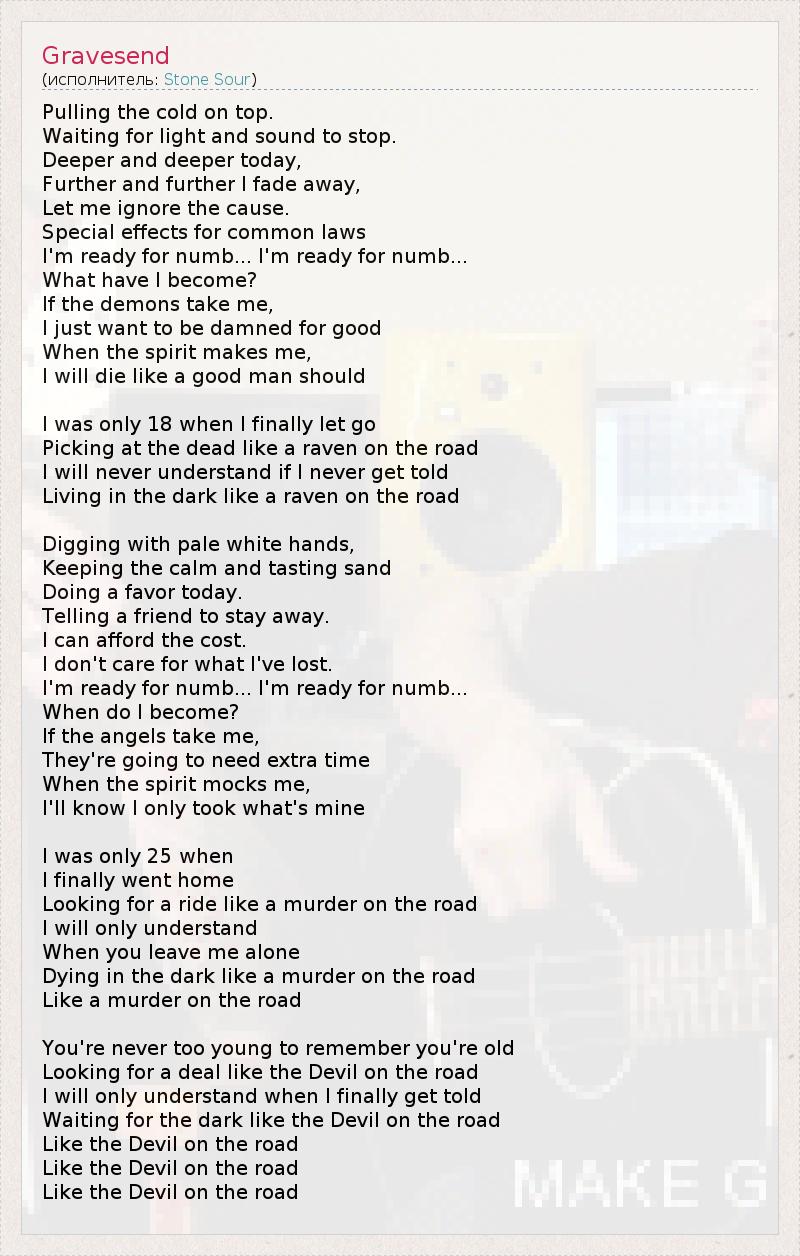 1 – Название песни образовано сложением двух слов – grave (могила) и send (посылать) и никакого отношения к городу Грейвсенд в Англии не имеет. В одном из интервью Кори Тейлор заявил, что главный герой песни приходит на это кладбище с множеством вопросов, которые терзают его, и,  фактически, это переломный момент в его жизни.