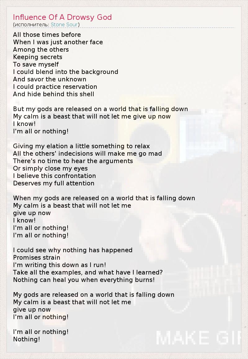 В прежние времена, Когда я ничем не отличался От остальных, Храня секреты, Чтобы спасти свою жизнь, Я мог не выделяться, Оставаться инкогнито, Я мог залечь на дно И укрыться за этим заслоном Но мои Боги оказались в мире, который рушится, Мое спокойствие - зверь, который не позволит мне сдаться, Я знаю! Я либо всё, либо ничто! Даю своей эйфории небольшую передышку, Чужие сомнения сведут меня с ума, Нет времени на выслушивание аргументов Или на то, чтоб просто закрыть глаза. Думаю, это противостояние Заслуживает моего внимания Когда мои Боги оказались в мире, который рушится, Мое спокойствие - зверь, который не позволит мне сдаться, Я знаю! Я либо всё, либо ничто! Либо всё, либо ничто! Мне было ясно, почему ничего не произошло, Обещания нарушены, Я пишу это, пока бегу! И какие же уроки я извлек из всего этого? Ничто не исцелит тебя, когда вокруг все пылает! Мои Боги оказались в мире, который рушится, Мое спокойствие - зверь, который не позволит мне сдаться, Я либо всё, либо ничто! Либо всё, либо ничто! Ничто!