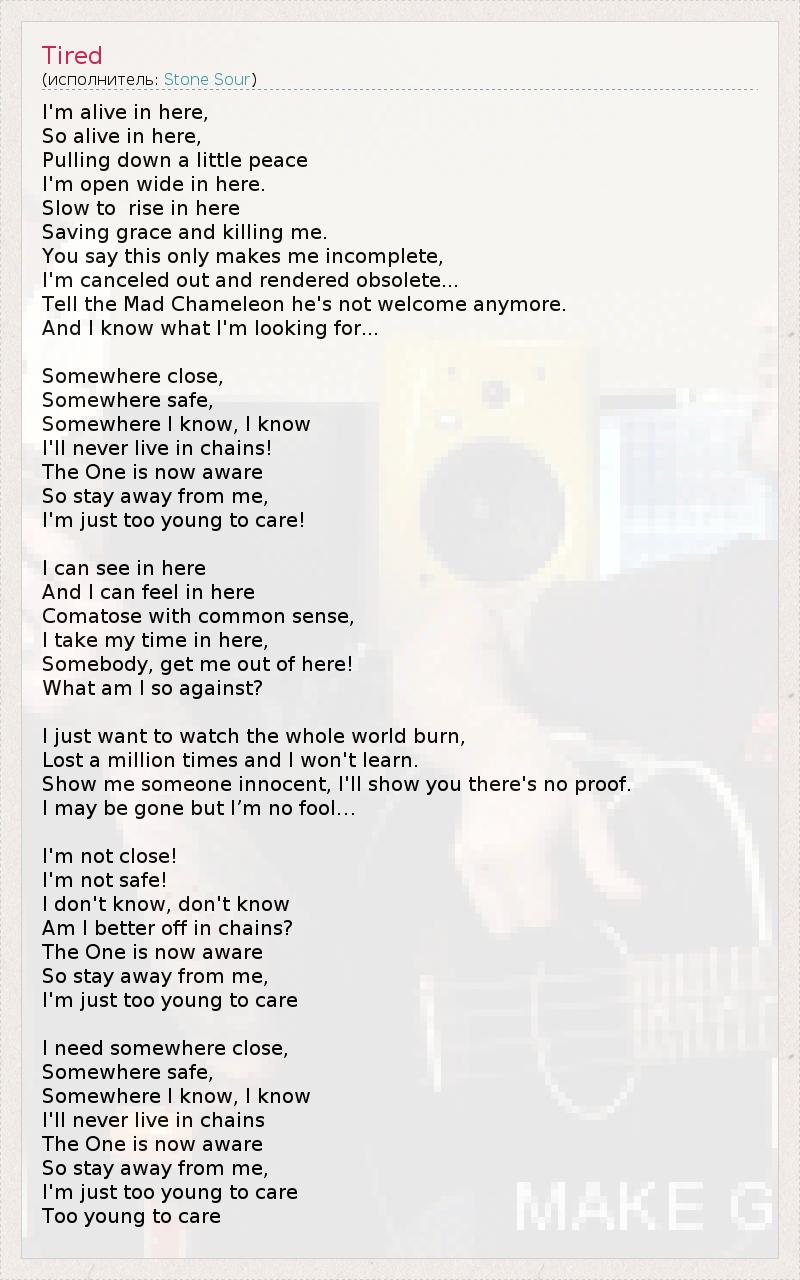 Здесь я живой, Такой живой, Находя немного успокоения, Здесь я открыт всему миру. Медленно поднимается Благодать, убивая меня. Ты говоришь, что это лишь делает меня слабее, Я вычеркнут, я забыт... Скажите Бешеному Хамелеону, что ему больше не рады. Я знаю, что я ищу... Место, что будет рядом, Где будет безопасно, Там, где - я знаю, я знаю - Я никогда не буду скован цепями! Всевышний знает об этом... Так что держись от меня подальше. Я слишком молод, чтобы о чем-то беспокоиться Здесь я вижу, Здесь я чувствую себя в коматозе, Однако мне присущ здравый смысл... Здесь я жду своего момента, Кто-нибудь, вытащите меня отсюда! Против чего я так протестую? Я просто хочу видеть, как этот мир горит, Я проиграл миллион раз, но так ничему и не научился! Покажи мне кого-нибудь невинного, и я скажу тебе, что их нет! Может, я и конченый, но я не дурак! Я далеко! Я в опасности! Я не знаю, ничего не знаю! Может, мне лучше в цепях? Всевышний знает... Так что держись от меня подальше, Я слишком молод, чтобы о чем-то беспокоиться Мне нужно место, что будет рядом, Где будет безопасно, Там, где - я знаю, я знаю - Я никогда не буду скован цепями! Всевышний об этом знает... Так что держись от меня подальше. Я слишком молод, чтобы о чем-то беспокоиться, Слишком молод, чтобы о чем-то беспокоиться