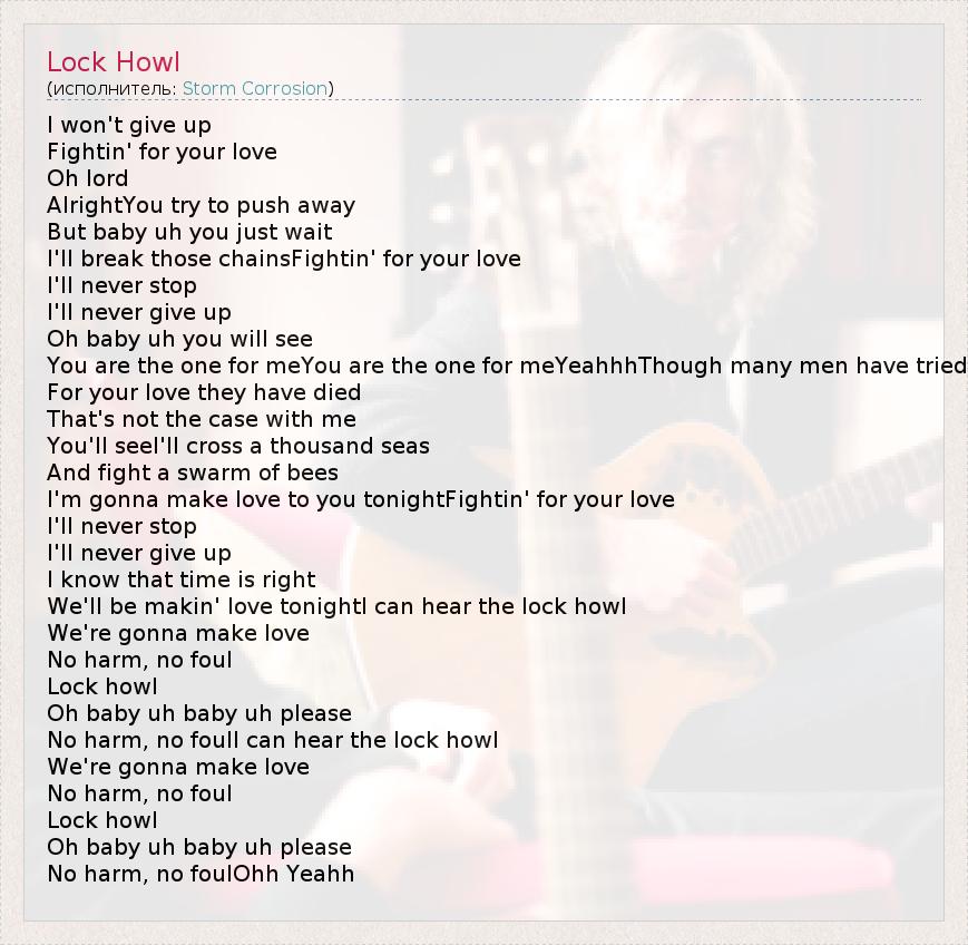 I won't give up Fightin' for your love Oh lord AlrightYou try to push away But baby uh you just wait I'll break those chainsFightin' for your love I'll never stop I'll never give up Oh baby uh you will see You are the one for meYou are the one for meYeahhhThough many men have tried For your love they have died That's not the case with me You'll seeI'll cross a thousand seas And fight a swarm of bees I'm gonna make love to you tonightFightin' for your love I'll never stop I'll never give up I know that time is right We'll be makin' love tonightI can hear the lock howl We're gonna make love No harm, no foul Lock howl Oh baby uh baby uh please No harm, no foulI can hear the lock howl We're gonna make love No harm, no foul Lock howl Oh baby uh baby uh please No harm, no foulOhh Yeahh