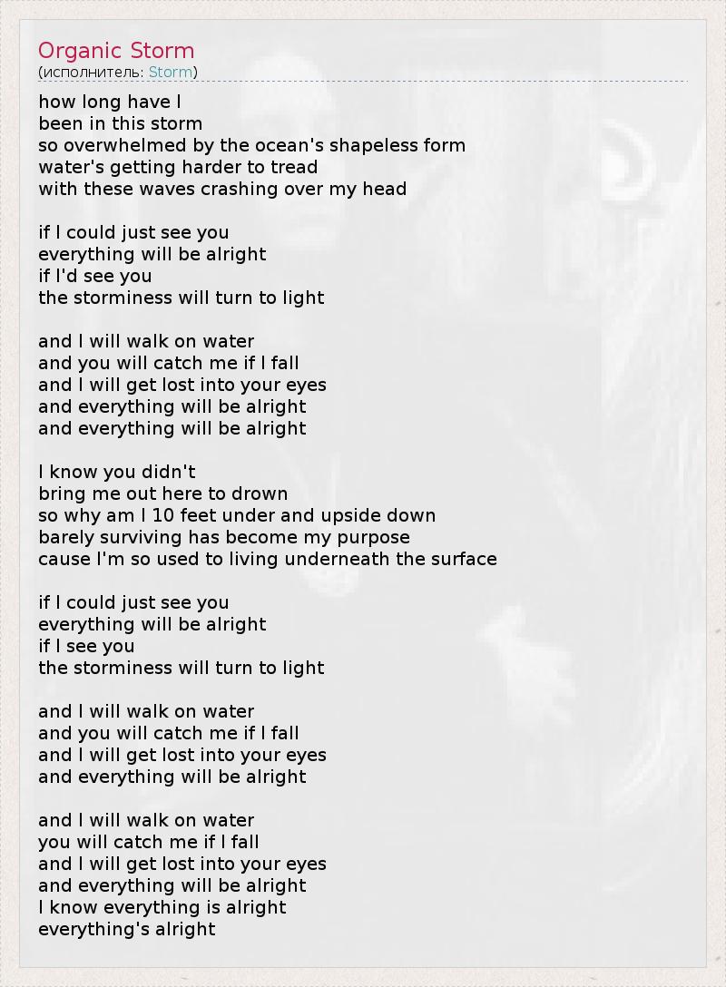how long have I been in this storm so overwhelmed by the ocean's shapeless form water's getting harder to tread with these waves crashing over my head if I could just see you everything will be alright if I'd see you the storminess will turn to light and I will walk on water and you will catch me if I fall and I will get lost into your eyes and everything will be alright and everything will be alright I know you didn't bring me out here to drown so why am I 10 feet under and upside down barely surviving has become my purpose cause I'm so used to living underneath the surface if I could just see you everything will be alright if I see you the storminess will turn to light and I will walk on water and you will catch me if I fall and I will get lost into your eyes and everything will be alright and I will walk on water you will catch me if I fall and I will get lost into your eyes and everything will be alright I know everything is alright everything's alright