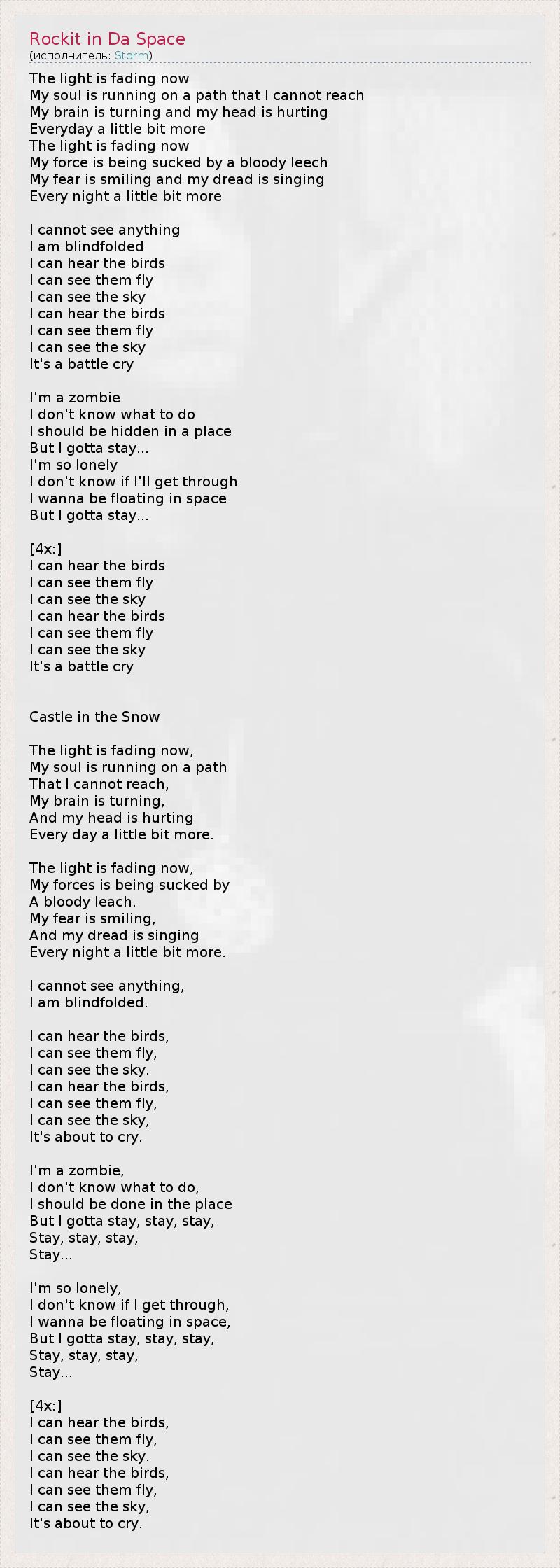 Свет медленно угасает, Моя душа тянется по недосягаемой тропе. Мысли кружатся вихрем, и голова болит С каждым днём немного сильнее. Свет медленно угасает, Мои силы вытягивает проклятая пиявка, Мой страх улыбается, а мой ужас поет С каждой ночью немного громче. Я ничего не вижу, У меня завязаны глаза. Я слышу птиц, Я смотрю, как они летят, Я вижу небо. Я слышу птиц, Я смотрю, как они летят, Я вижу небо. Это боевой клич. Я зомби, Я не знаю, что мне делать, Мне нужно где-то спрятаться, Но я должна остаться. Мне так одиноко, Не знаю, выдержу ли я, Я хочу плыть в космосе, Но я должна остаться. [4x:] Я слышу птиц, Я смотрю, как они летят, Я вижу небо. Я слышу птиц, Я смотрю, как они летят, Я вижу небо. Это боевой клич. Замок в снегу (перевод VeeWai) Сейчас свет меркнет, Моя душа тянется по тропе, До которой мне не достать. Мысли вьются вихрем, И голова болит Чуть сильнее с каждым днём. Сейчас свет меркнет, Мои силы высасывает Проклятая пиявка. Мой страх улыбается, А мой ужас поёт Чуть громче с каждой ночью. Я ничего не вижу, Я ослеплён. Я слышу птиц, Я вижу их полёт, Я вижу небо. Я слышу птиц, Я вижу их полёт, Я вижу небо, Оно вот-вот заплачет. Я зомби, Я не знаю, что делать, Мне нужно было закончить свои дела здесь, Но придётся остаться, остаться, остаться, Остаться, остаться, остаться, Остаться... Мне так одиноко, Не знаю, прорвусь ли я, Я хочу парить в пустоте, Но придётся остаться, остаться, остаться, Остаться, остаться, остаться, Остаться... [4x:] Я слышу птиц, Я вижу их полёт, Я вижу небо. Я слышу птиц, Я вижу их полёт, Я вижу небо, Оно вот-вот заплачет.