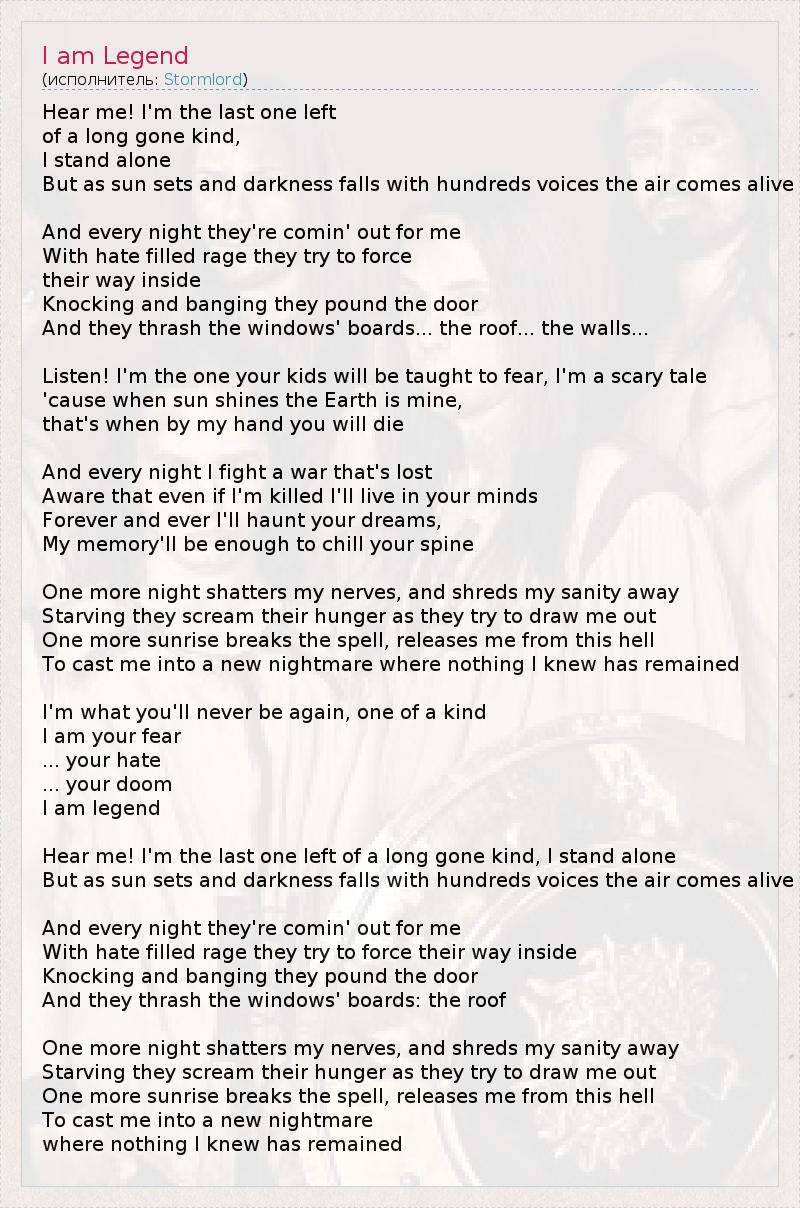 Hear me! I'm the last one left of a long gone kind, I stand alone But as sun sets and darkness falls with hundreds voices the air comes alive And every night they're comin' out for me With hate filled rage they try to force their way inside Knocking and banging they pound the door And they thrash the windows' boards... the roof... the walls... Listen! I'm the one your kids will be taught to fear, I'm a scary tale 'cause when sun shines the Earth is mine, that's when by my hand you will die And every night I fight a war that's lost Aware that even if I'm killed I'll live in your minds Forever and ever I'll haunt your dreams, My memory'll be enough to chill your spine One more night shatters my nerves, and shreds my sanity away Starving they scream their hunger as they try to draw me out One more sunrise breaks the spell, releases me from this hell To cast me into a new nightmare where nothing I knew has remained I'm what you'll never be again, one of a kind I am your fear ... your hate ... your doom I am legend Hear me! I'm the last one left of a long gone kind, I stand alone But as sun sets and darkness falls with hundreds voices the air comes alive And every night they're comin' out for me With hate filled rage they try to force their way inside Knocking and banging they pound the door And they thrash the windows' boards: the roof One more night shatters my nerves, and shreds my sanity away Starving they scream their hunger as they try to draw me out One more sunrise breaks the spell, releases me from this hell To cast me into a new nightmare where nothing I knew has remained