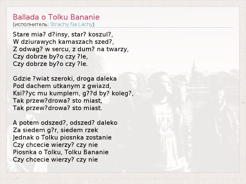 Stare mia? d?insy, star? koszul?, W dziurawych kamaszach szed?, Z odwag? w sercu, z dum? na twarzy, Czy dobrze by?o czy ?le, Czy dobrze by?o czy ?le. Gdzie ?wiat szeroki, droga daleka Pod dachem utkanym z gwiazd, Ksi??yc mu kumplem, g??d by? koleg?, Tak przew?drowa? sto miast, Tak przew?drowa? sto miast. A potem odszed?, odszed? daleko Za siedem g?r, siedem rzek Jednak o Tolku piosnka zostanie Czy chcecie wierzy? czy nie Piosnka o Tolku, Tolku Bananie Czy chcecie wierzy? czy nie