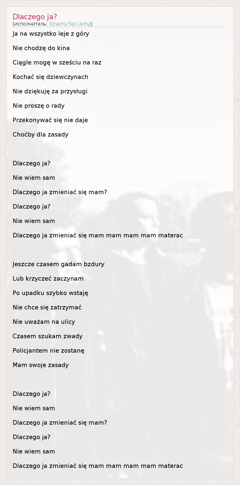 Ja na wszystko leje z góry Nie chodzę do kina Ciągle mogę w sześciu na raz Kochać się dziewczynach Nie dziękuję za przysługi Nie proszę o rady Przekonywać się nie daje Choćby dla zasady Dlaczego ja? Nie wiem sam Dlaczego ja zmieniać się mam? Dlaczego ja? Nie wiem sam Dlaczego ja zmieniać się mam mam mam mam materac Jeszcze czasem gadam bzdury Lub krzyczeć zaczynam Po upadku szybko wstaję Nie chce się zatrzymać Nie uważam na ulicy Czasem szukam zwady Policjantem nie zostanę Mam swoje zasady Dlaczego ja? Nie wiem sam Dlaczego ja zmieniać się mam? Dlaczego ja? Nie wiem sam Dlaczego ja zmieniać się mam mam mam mam materac