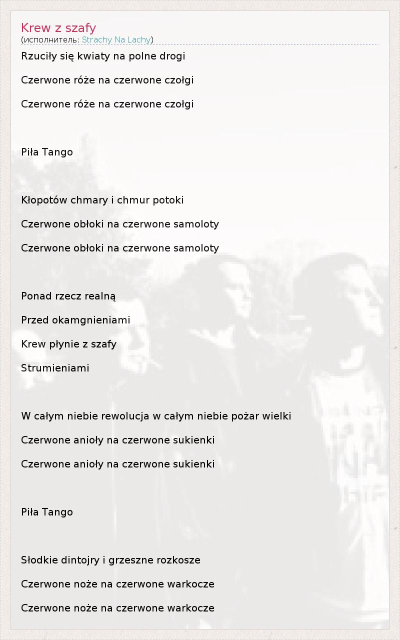 Это интересно:Strachy Na Lachy (properly Międzymiastówka Muzykująca Strachy Na Lachy) is a Polish rock band (originally known as Grabaż + Ktoś Tam Jeszcze before becoming Grabaż i Strachy Na Lachy).Strachy na Lachy (Empty Threats) is led by Krzysztof "Grabaż" Grabowski and Andrzej "Kozak" Kozakiewicz, who also play in the punk group Pidżama Porno. They formed Strachy na Lachy in order to play softer music, such as rock ballads. Their first album, Strachy na Lachy, was released in August 2003, and a second, Piła Tango, the title track of which became their first hit, was released at the end of 2005.They often play in the Piwnica 21 Club in Poznań.The artwork for the... продолжение