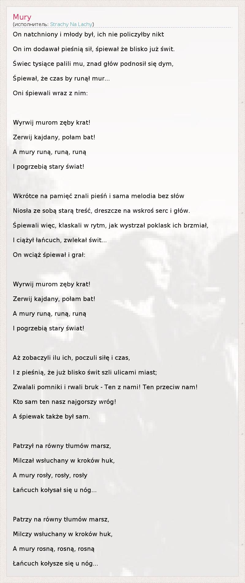 On natchniony i młody był, ich nie policzyłby nikt On im dodawał pieśnią sił, śpiewał że blisko już świt. Świec tysiące palili mu, znad głów podnosił się dym, Śpiewał, że czas by runął mur... Oni śpiewali wraz z nim: Wyrwij murom zęby krat! Zerwij kajdany, połam bat! A mury runą, runą, runą I pogrzebią stary świat! Wkrótce na pamięć znali pieśń i sama melodia bez słów Niosła ze sobą starą treść, dreszcze na wskroś serc i głów. Śpiewali więc, klaskali w rytm, jak wystrzał poklask ich brzmiał, I ciążył łańcuch, zwlekał świt... On wciąż śpiewał i grał: Wyrwij murom zęby krat! Zerwij kajdany, połam bat! A mury runą, runą, runą I pogrzebią stary świat! Aż zobaczyli ilu ich, poczuli siłę i czas, I z pieśnią, że już blisko świt szli ulicami miast; Zwalali pomniki i rwali bruk - Ten z nami! Ten przeciw nam! Kto sam ten nasz najgorszy wróg! A śpiewak także był sam. Patrzył na równy tłumów marsz, Milczał wsłuchany w kroków huk, A mury rosły, rosły, rosły Łańcuch kołysał się u nóg... Patrzy na równy tłumów marsz, Milczy wsłuchany w kroków huk, A mury rosną, rosną, rosną Łańcuch kołysze się u nóg...