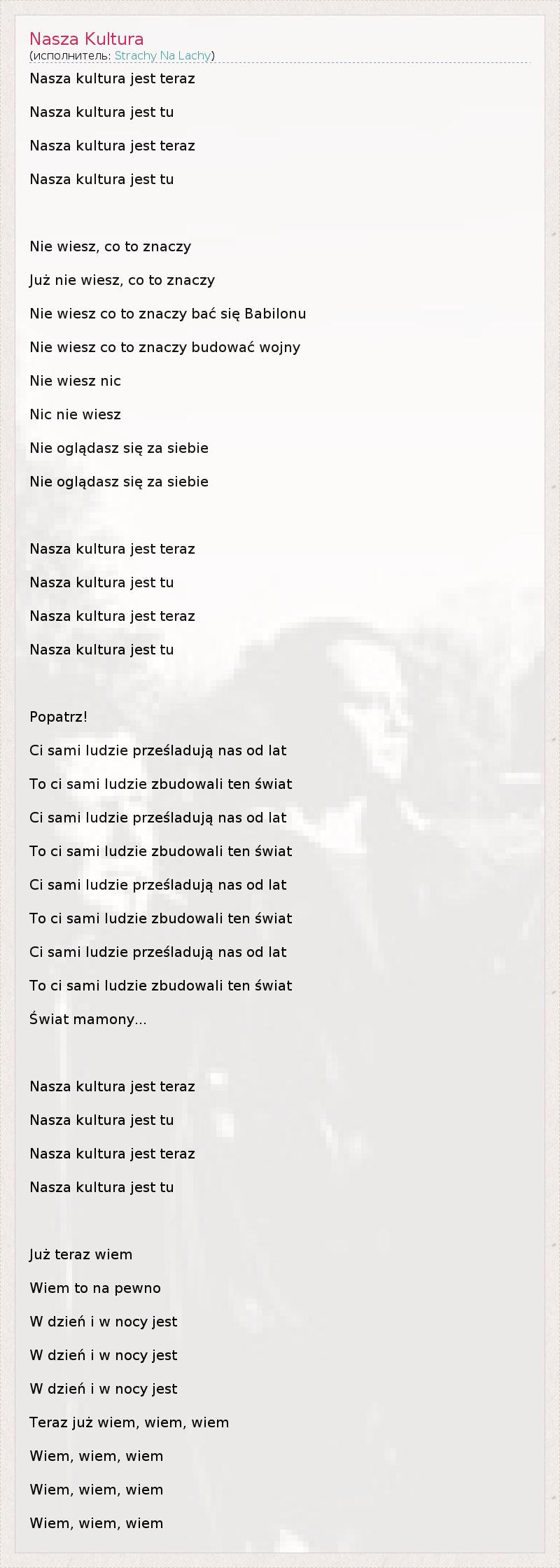 Nasza kultura jest teraz Nasza kultura jest tu Nasza kultura jest teraz Nasza kultura jest tu Nie wiesz, co to znaczy Już nie wiesz, co to znaczy Nie wiesz co to znaczy bać się Babilonu Nie wiesz co to znaczy budować wojny Nie wiesz nic Nic nie wiesz Nie oglądasz się za siebie Nie oglądasz się za siebie Nasza kultura jest teraz Nasza kultura jest tu Nasza kultura jest teraz Nasza kultura jest tu Popatrz! Ci sami ludzie prześladują nas od lat To ci sami ludzie zbudowali ten świat Ci sami ludzie prześladują nas od lat To ci sami ludzie zbudowali ten świat Ci sami ludzie prześladują nas od lat To ci sami ludzie zbudowali ten świat Ci sami ludzie prześladują nas od lat To ci sami ludzie zbudowali ten świat Świat mamony... Nasza kultura jest teraz Nasza kultura jest tu Nasza kultura jest teraz Nasza kultura jest tu Już teraz wiem Wiem to na pewno W dzień i w nocy jest W dzień i w nocy jest W dzień i w nocy jest Teraz już wiem, wiem, wiem Wiem, wiem, wiem Wiem, wiem, wiem Wiem, wiem, wiem