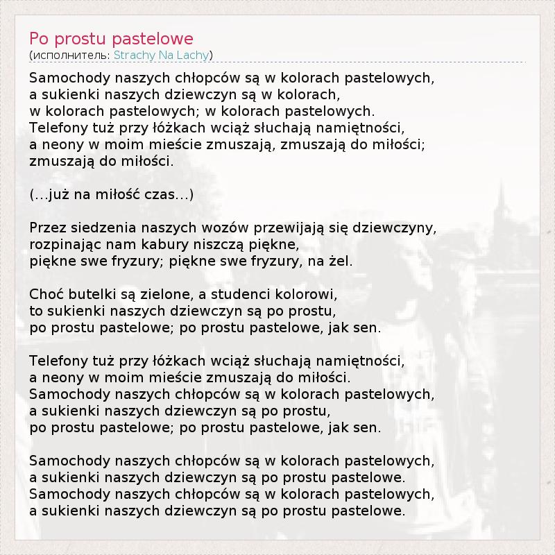 Samochody naszych chłopców są w kolorach pastelowych, a sukienki naszych dziewczyn są w kolorach, w kolorach pastelowych; w kolorach pastelowych. Telefony tuż przy łóżkach wciąż słuchają namiętności, a neony w moim mieście zmuszają, zmuszają do miłości; zmuszają do miłości. (…już na miłość czas…) Przez siedzenia naszych wozów przewijają się dziewczyny, rozpinając nam kabury niszczą piękne, piękne swe fryzury; piękne swe fryzury, na żel. Choć butelki są zielone, a studenci kolorowi, to sukienki naszych dziewczyn są po prostu, po prostu pastelowe; po prostu pastelowe, jak sen. Telefony tuż przy łóżkach wciąż słuchają namiętności, a neony w moim mieście zmuszają do miłości. Samochody naszych chłopców są w kolorach pastelowych, a sukienki naszych dziewczyn są po prostu, po prostu pastelowe; po prostu pastelowe, jak sen. Samochody naszych chłopców są w kolorach pastelowych, a sukienki naszych dziewczyn są po prostu pastelowe. Samochody naszych chłopców są w kolorach pastelowych, a sukienki naszych dziewczyn są po prostu pastelowe.